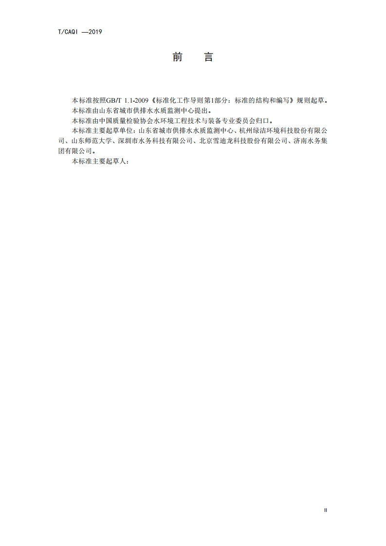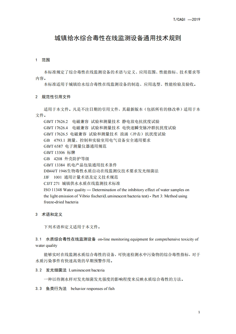 城镇给水综合毒性在线监测设备-通用技术规则-General-Technical-Provision-for-Comprehensive-Toxicity-On-line-Monitoring-Equipment-of-Urban-Water-Supply348072@abc9天前发布关注私信0.78MB17页038城镇给水综合毒性在线监测设备-通用技术规则-General-Technical-Provision-for-Comprehensive-Toxicity-On-line-Monitoring-Equipment-of-Urban-Water-Supply此内容为付费资源,请付费后查看¥19¥39黄金会员免费钻石会员免费立即购买您当前未登录!建议登陆后购买,可保存购买订单付费资源 第1页 / 共17页 第2页 / 共17页 第3页 / 共17页 第4页 / 共17页 第5页 / 共17页 试读已结束,还剩12页,您可下载完整版后进行离线阅读 THE END标准规范 文本预览 T/CAQ1-2019ICST/CAQI中国质量检验协会团体标准T/CAQI-2019城镇给水综合毒性在线监测设备通用技术规则General Technical Provision for Comprehensive Toxicity On-lineMonitoring Equipment of Urban Water Supply2019--发布2019-实施中国质量检验协会发布 查看更多 收起部分 喜欢就支持一下吧收藏