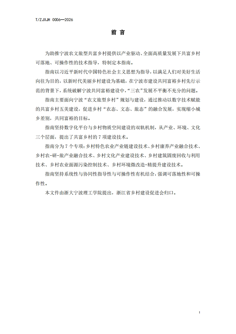 宁波市共同富裕乡村建设技术指南-Technical-Guide-for-Common-Prosperity-Village-Construction-in-Ningbo-City-(征求意见稿)348072@abc10天前发布关注私信0.41MB50页031宁波市共同富裕乡村建设技术指南-Technical-Guide-for-Common-Prosperity-Village-Construction-in-Ningbo-City-(征求意见稿)此内容为付费资源,请付费后查看¥19¥39黄金会员免费钻石会员免费立即购买您当前未登录!建议登陆后购买,可保存购买订单付费资源 第1页 / 共50页 第2页 / 共50页 第3页 / 共50页 第4页 / 共50页 第5页 / 共50页 试读已结束,还剩45页,您可下载完整版后进行离线阅读 THE END标准规范 文本预览 ICS03.080CCS A00ZXE团体标准T/ZJXJH0006-2026宁波市共同富裕乡村建设技术指南Technical Guide for Common Prosperity Village Construction in Ningbo City(征求意见稿)2026-XX-XX发布2026-XX-XX实施浙江省乡村建设促进会发布 查看更多 收起部分 喜欢就支持一下吧收藏