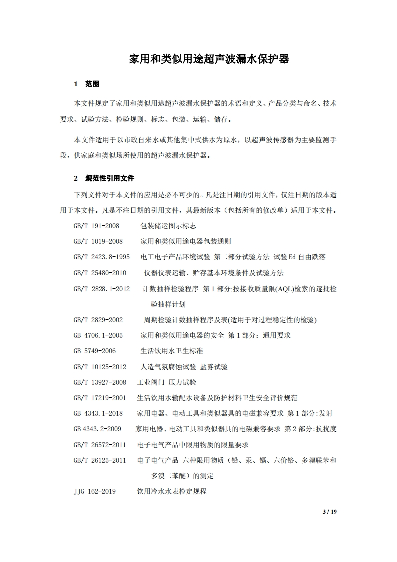 家用和类似用途超声波漏水保护器-ater-leakage-protector-with-ultrasonic-sensor-for-household-and-similar-use-(征求意见稿)348072@abc10天前发布关注私信0.45MB19页047家用和类似用途超声波漏水保护器-ater-leakage-protector-with-ultrasonic-sensor-for-household-and-similar-use-(征求意见稿)此内容为付费资源,请付费后查看¥19¥39黄金会员免费钻石会员免费立即购买您当前未登录!建议登陆后购买,可保存购买订单付费资源 第1页 / 共19页 第2页 / 共19页 第3页 / 共19页 第4页 / 共19页 第5页 / 共19页 试读已结束,还剩14页,您可下载完整版后进行离线阅读 THE END标准规范 文本预览 CAQI团体标准T/CAQI XXX-2020家用和类似用途超声波漏水保护器water leakage protector with ultrasonic sensor for household andsimilar use(征求意见稿)2020-XX-XX发布2021-XX-XX实施中国质量检验协会发布 查看更多 收起部分 喜欢就支持一下吧收藏