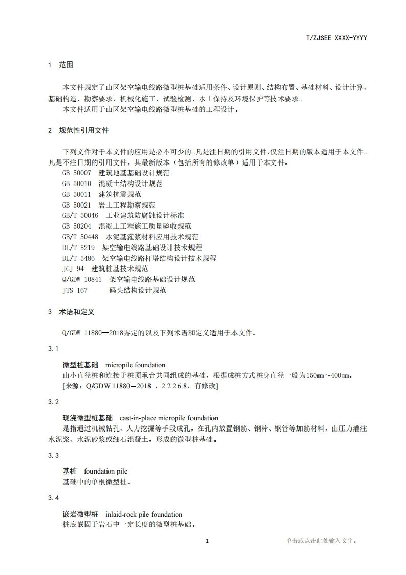 山区架空输电线路微型桩基础技术规范-Technical-specification-for-micro-pile-foundation-of-mountainous-overhead-transmission-ines-(与国际标准一致性程度的标识)348072@abc11天前发布关注私信0.37MB17页028山区架空输电线路微型桩基础技术规范-Technical-specification-for-micro-pile-foundation-of-mountainous-overhead-transmission-ines-(与国际标准一致性程度的标识)此内容为付费资源,请付费后查看¥19¥39黄金会员免费钻石会员免费立即购买您当前未登录!建议登陆后购买,可保存购买订单付费资源 第1页 / 共17页 第2页 / 共17页 第3页 / 共17页 第4页 / 共17页 第5页 / 共17页 试读已结束,还剩12页,您可下载完整版后进行离线阅读 THE END标准规范 文本预览 T/Z☑SEE XXXX-WW浙江省电力学会标准T/ZJSEE XXXX-YYYY山区架空输电线路微型桩基础技术规范Technical specification for micro pile foundation of mountainousoverhead transmission I ines(与国际标准一致性程度的标识)(征求意见稿)20XX--XX-XX发布20XX-XX-XX实施浙江省电力学会发布 查看更多 收起部分 喜欢就支持一下吧收藏