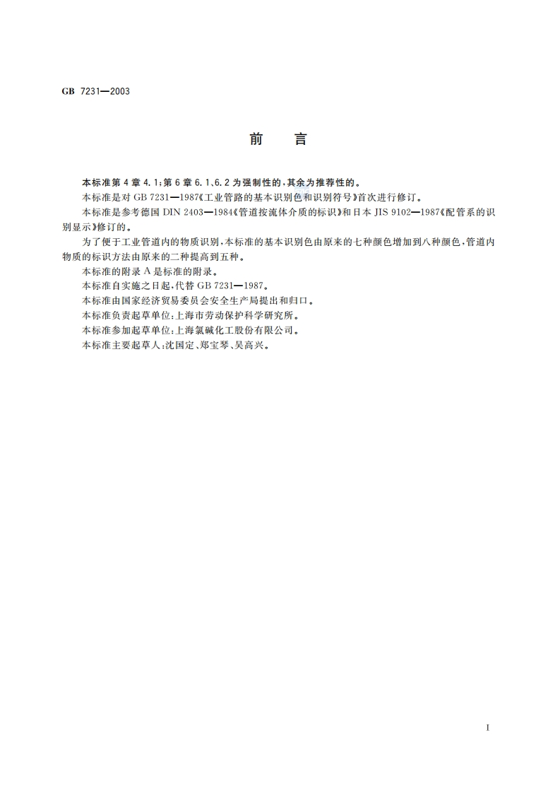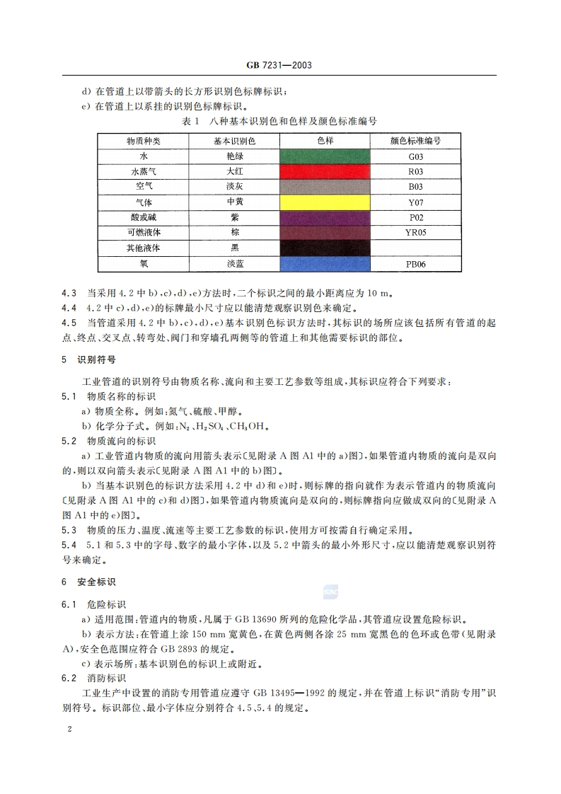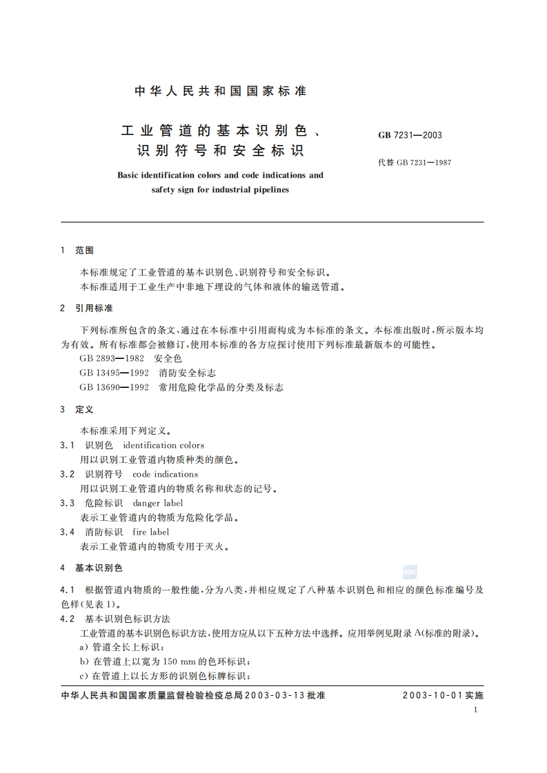 ICS13.100C65中华人民共和国国家标准GB7231-2003工业管道的基本识别色、识别符号和安全标识Basic identification colors and code indications andsafety sign for industrial pipelines国家标准全文公开系统专用,此文本仅供个人学习、研究之用,未经授权,禁止复制、发行、汇编、翻译或网铬传播等,侵权必究。全国标准信息公共服务平台:https:/std.sam.gow.cm2003-03-13发布2003-10-01实施中华人民共和国国家质量监督检验检疫总局发布