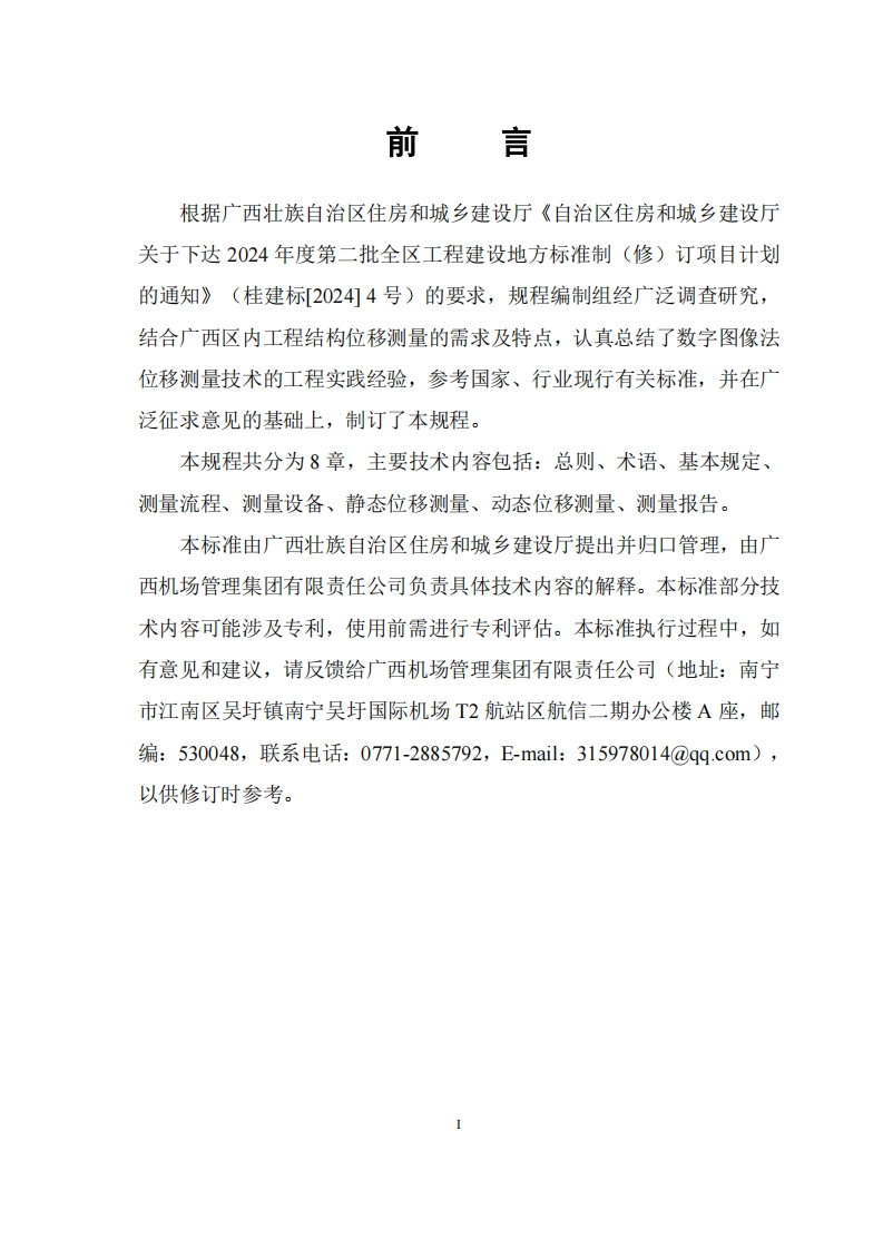 广西壮族自治区工程建设地方标准DBDBJ/T45-xxx-2025备案号:JXXXXX-2025工程结构数字图像法位移测量技术规程Technical Specification for Displacement Measurement of EngineeringStructures Using Digital Image Processing(征求意见稿)2026年xx月x发布2026年Xx月Xx实施广西壮族自治区住房和城乡建设厅发布