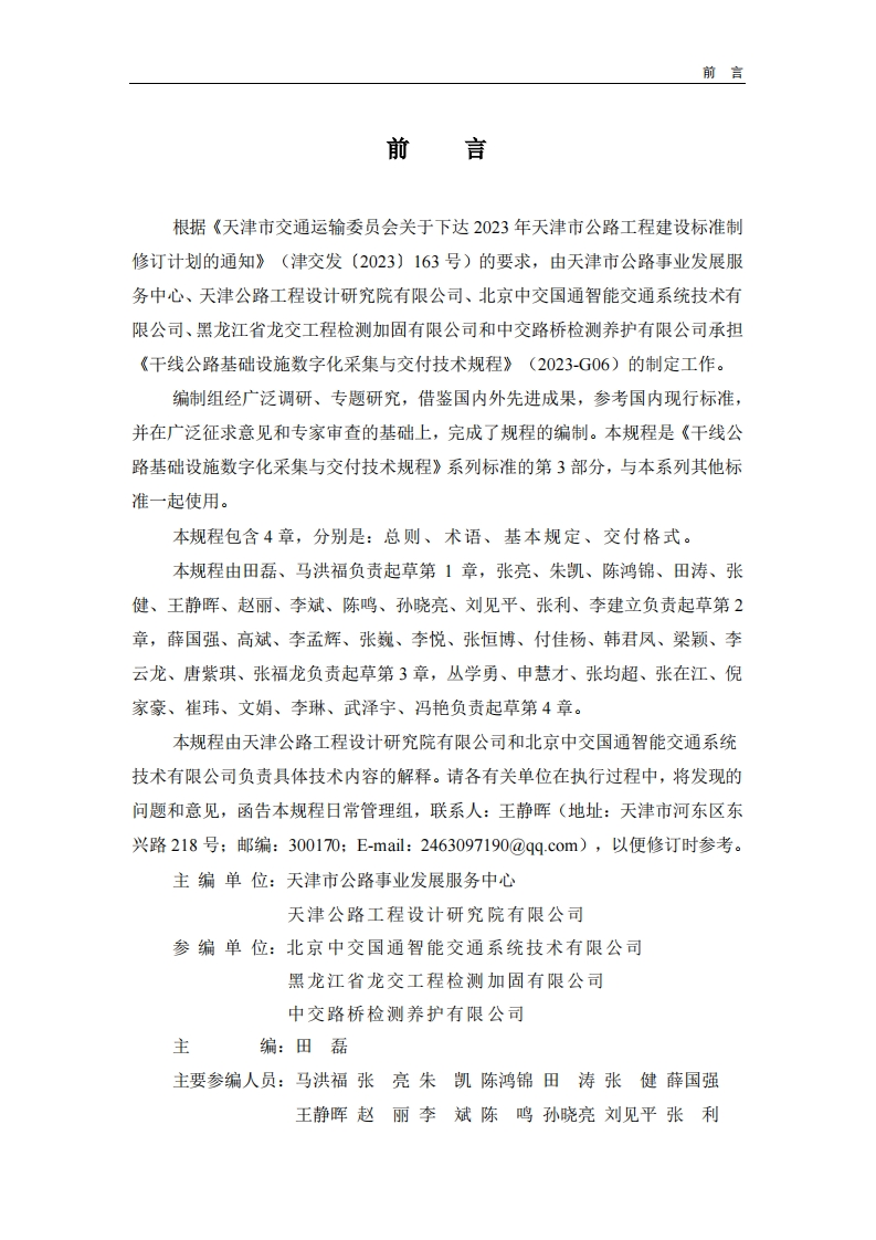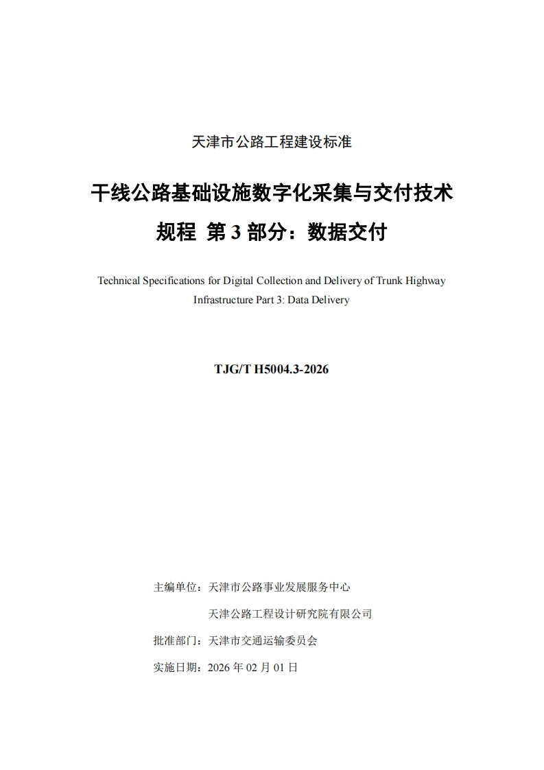 干线公路基础设施数字化采集与交付-技术规程第3部分_数据交付-Technical-Specifications-for-Digital-Collection-and-Delivery-of-Trunk-Highway-Infrastructure-Part-3_Data-Delivery348072@abc11天前发布关注私信0.46MB15页048干线公路基础设施数字化采集与交付-技术规程第3部分_数据交付-Technical-Specifications-for-Digital-Collection-and-Delivery-of-Trunk-Highway-Infrastructure-Part-3_Data-Delivery此内容为付费资源,请付费后查看¥19¥39黄金会员免费钻石会员免费立即购买您当前未登录!建议登陆后购买,可保存购买订单付费资源 第1页 / 共15页 第2页 / 共15页 第3页 / 共15页 第4页 / 共15页 第5页 / 共15页 试读已结束,还剩10页,您可下载完整版后进行离线阅读 THE END标准规范 文本预览 TJG天津市公路工程建设标准TJG/TH5004.3-2026千线公路基础设施数字化采集与交付技术规程第3部分:数据交付Technical Specifications for Digital Collection and Delivery of Trunk HighwayInfrastructure Part 3:Data Delivery2026-01-01发布2026-02-01实施天津市交通运输委员会发布 查看更多 收起部分 喜欢就支持一下吧收藏