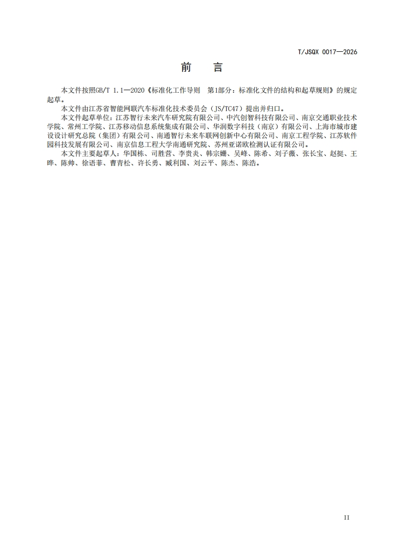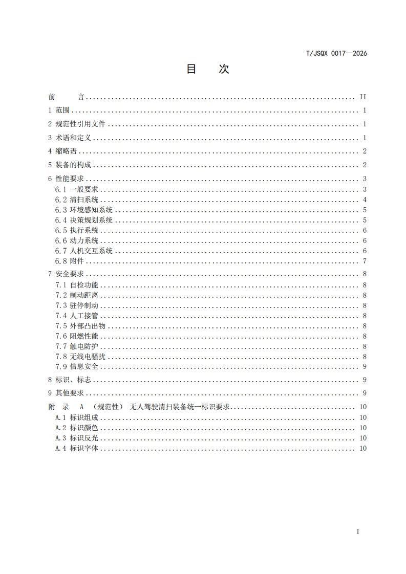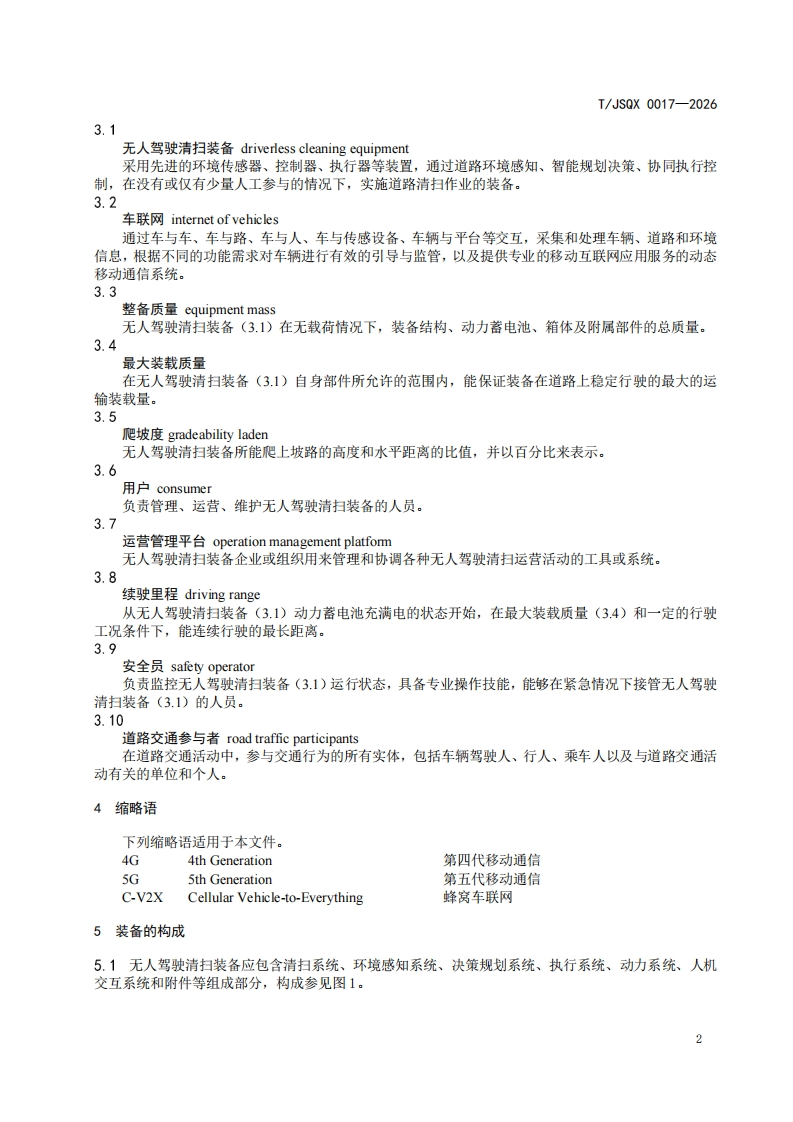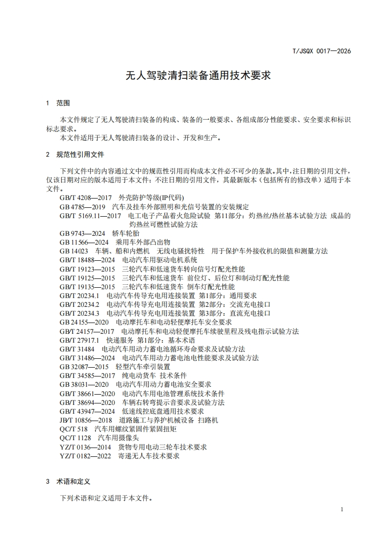 无人驾驶清扫装备通用技术要求-General-technical-requirements-for-driverless-cleaning-equipment348072@abc10天前发布关注私信0.81MB13页038无人驾驶清扫装备通用技术要求-General-technical-requirements-for-driverless-cleaning-equipment此内容为付费资源,请付费后查看¥19¥39黄金会员免费钻石会员免费立即购买您当前未登录!建议登陆后购买,可保存购买订单付费资源 第1页 / 共13页 第2页 / 共13页 第3页 / 共13页 第4页 / 共13页 第5页 / 共13页 试读已结束,还剩8页,您可下载完整版后进行离线阅读 THE END标准规范 文本预览 ICS43.080.99CCS T51T/JSOX江苏省汽车行业协会团体标准T/JS0X0017-2026代替T/JSQX0017-2024无人驾驶清扫装备通用技术要求General technical requirements for driverless cleaning equipment2026-01-09发布2026-02-09实施江苏省汽车行业协会发布 查看更多 收起部分 喜欢就支持一下吧收藏