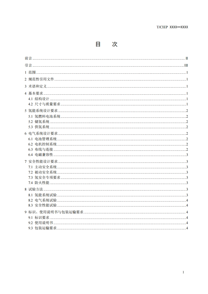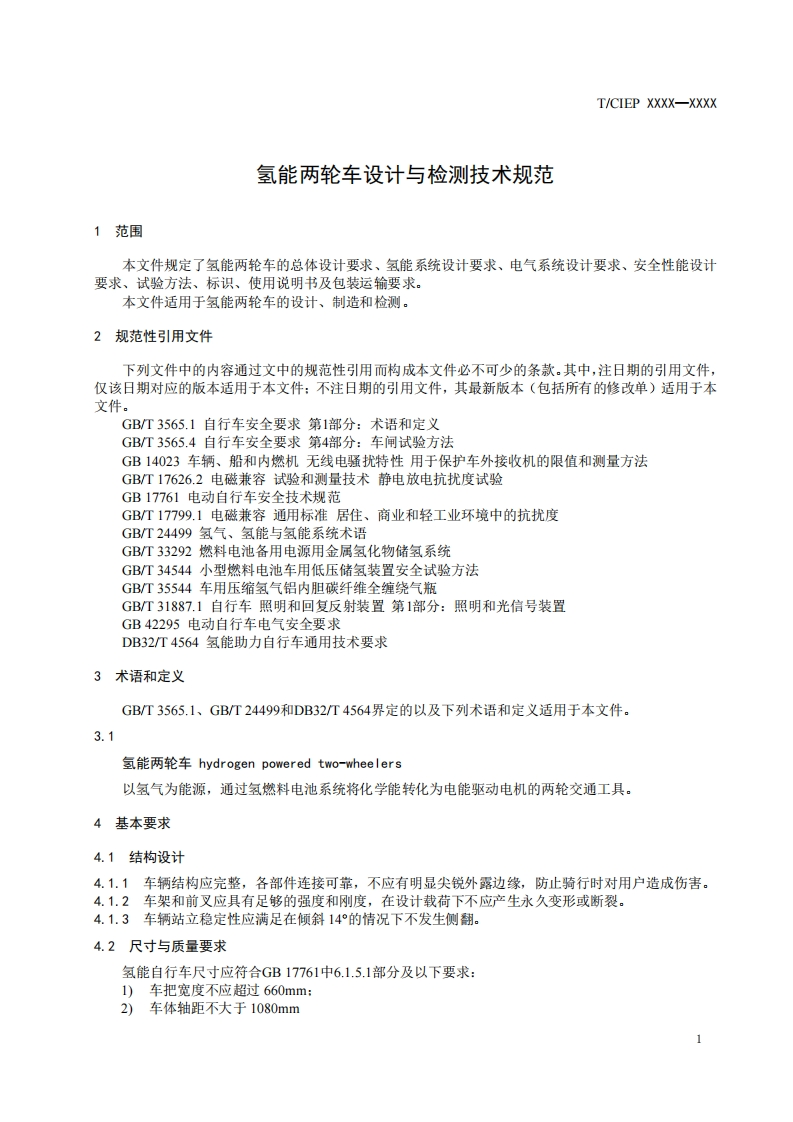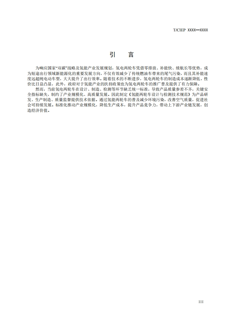 ICS43.040CCS T99/CIEP中国工业环保促进会团体标准T/CIEP XXXX-XXXX氢能两轮车设计与检测技术规范Technical specifications for design and testing of hydrogen powered two-wheelers(征求意见稿)在提交反债意见时,请将您知道的相关专利连同支持性文件一并附上。XXXX-XX-XX发布XXXX-XX-XX实施中国工业环保促进会发布
