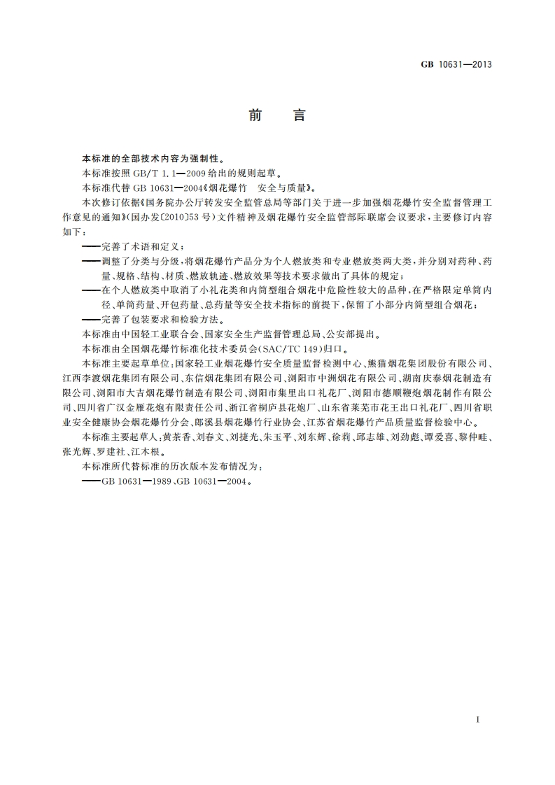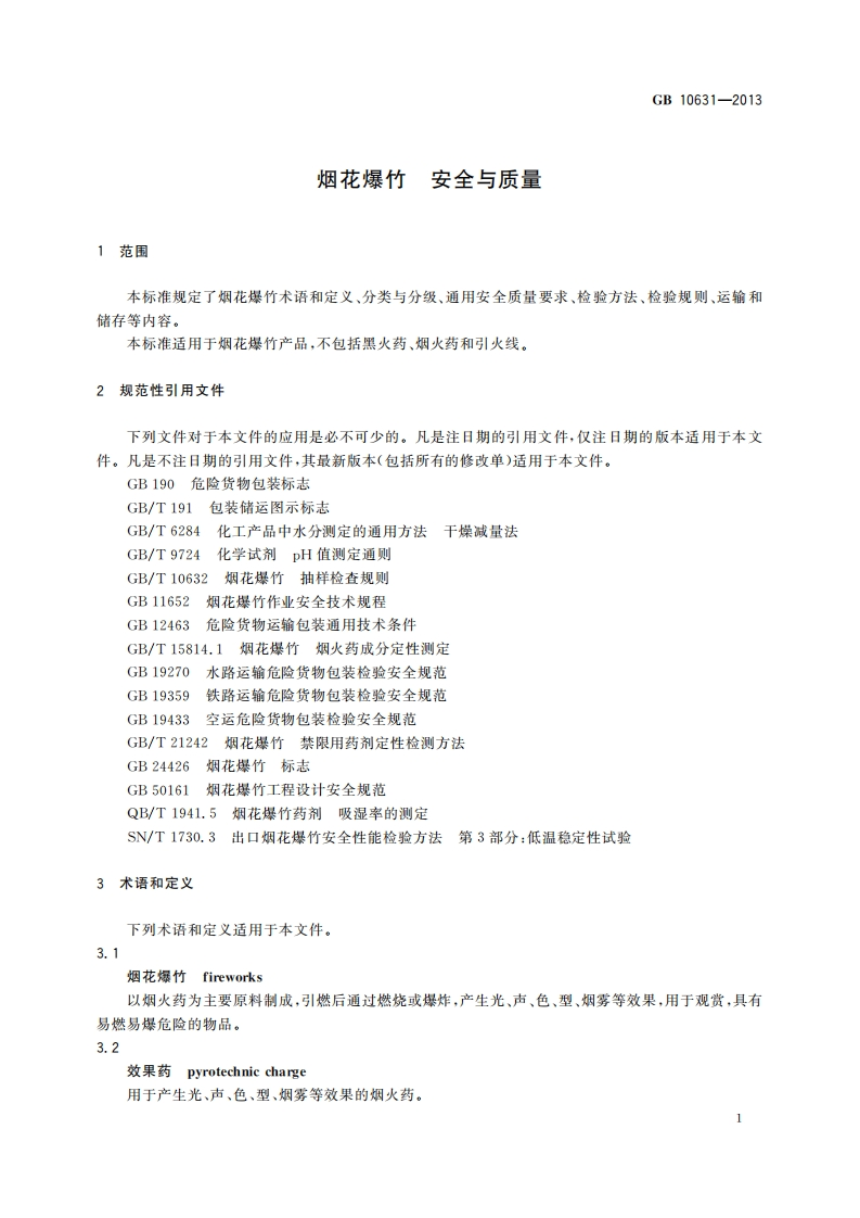 烟花爆竹-安全与质量-Safety-and-quality-for-fireworks348072@abc9天前发布关注私信0.53MB20页024烟花爆竹-安全与质量-Safety-and-quality-for-fireworks此内容为付费资源,请付费后查看¥19¥39黄金会员免费钻石会员免费立即购买您当前未登录!建议登陆后购买,可保存购买订单付费资源 第1页 / 共20页 第2页 / 共20页 第3页 / 共20页 第4页 / 共20页 第5页 / 共20页 试读已结束,还剩15页,您可下载完整版后进行离线阅读 THE END标准规范 文本预览 1CS71.100.30Y88中华人民共和国国家标准GB10631-2013代替GB10631一2004烟花爆竹安全与质量Safety and quality for fireworks2013-02-07发布2013-03-01实施中华人民共和国国家质量监督检验检疫总局发布中国国家标准化管理委员会 查看更多 收起部分 喜欢就支持一下吧收藏