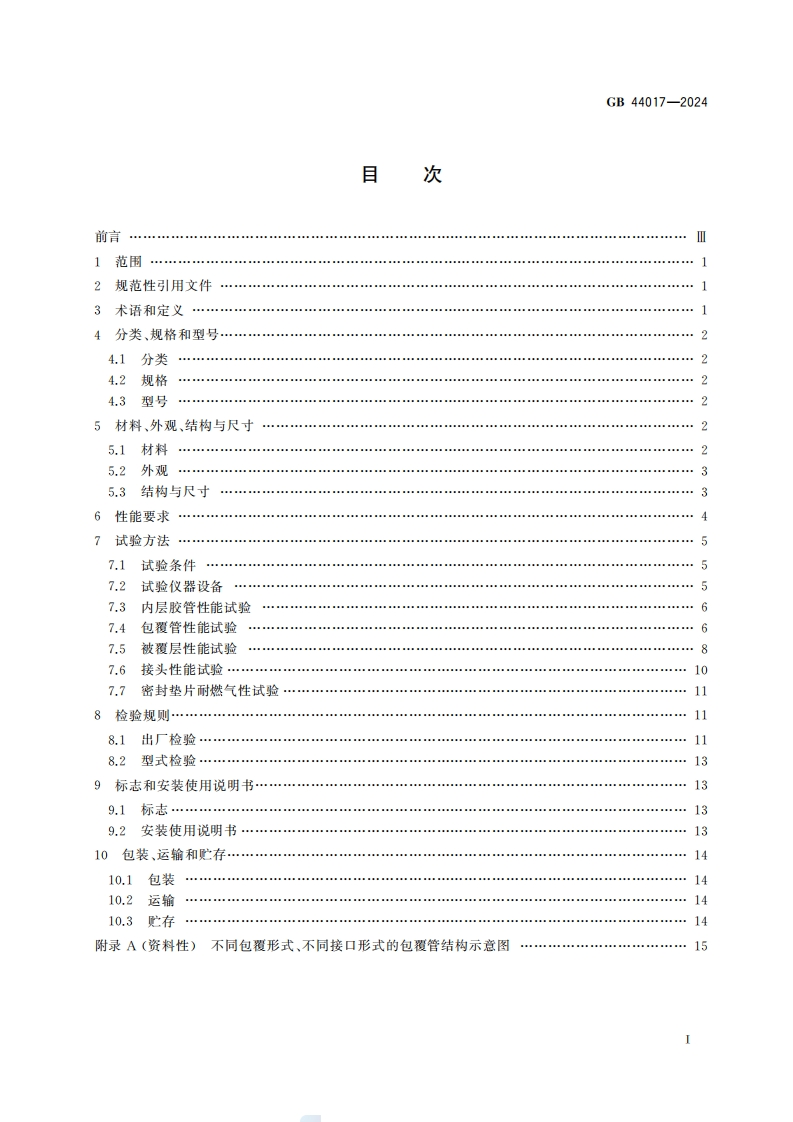 ICS91.140CCS P 45中华人民共和国国家标准GB44017-2024燃气用具连接用金属包覆软管Armouring hose for the connection of gas appliance国家标准全文公开系统专用,此文本仅供个人学习、研究之用,未经授权,禁止复制、发行、汇编、翻译或网铬传播等,侵权必究全国标准信息公共服务平台:https:/std.sam.gow.cm2024-04-29发布2024-08-01实施国家市场监督管理兽局发布国家标准化管理委员会