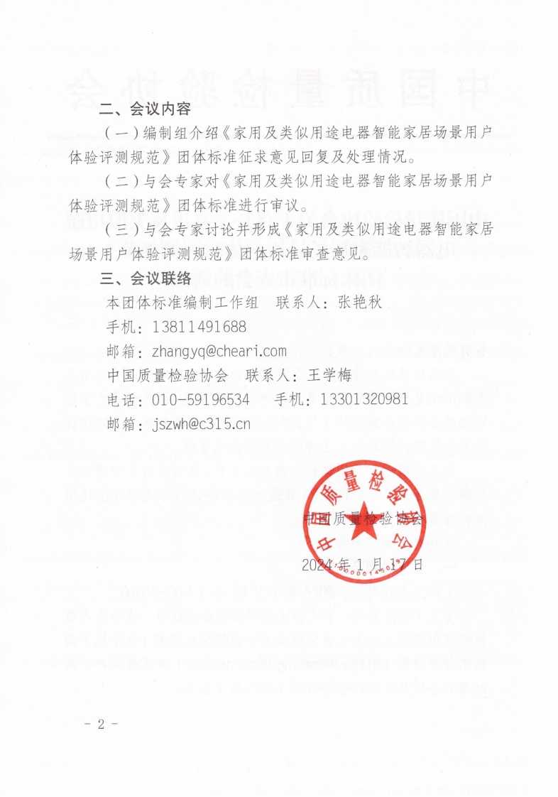 中国质量检验协会质检协函〔2024〕11号中国质量检验协会关于召开《家用及类似用途电器智能家居场景用户体验评测规范》团体标准审查会的通知各有关专家和相关人员:中国质量检验协会(以下简称我协会)组织制定的《家用及类似用途电器智能家居场景用户体验评测规范》团体标准已于前期完成公开征求意见的工作,并于日前对所征集的意见和建议进行汇总处理,据此形成上述团体标准的送审稿。为及时推进上述团体标准的制定工作,我协会决定按照相关程序规定于2024年1月23日通过线上会议的方式召开上述团体标准审查会。回现就有关事宜通知如下:一、会议时间及方式(一)会议时间:2024年1月23日14:00-17:00(二)会议方式:本次会议使用腾讯会议软件,请参会人员提前使用笔记本电脑(确保摄像头和话筒功能完好)或手机下载腾讯会议软件(https::/meeting..tencent.com/)并注册账户,届时录入会议号(207-279-158)进入线上会场。-1-