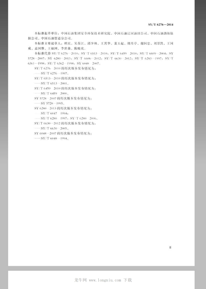 E09备案号:48192-2015SY中华人民共和国石油天然气行业标准SY/T6276-2014代替SY/T(7%3.SY/T(53-3i.SY/T5)-3,SY/T(4w-34.SY572s-37.SY(N)-313.SY/T 666-3012.SY/T 6630-3012.SY/T 623-197.SY/T 6361-19.SY/T 6%62-198.SY (8-31石油天然气工业健康、安全与环境管理体系Petroleum and natural gas industrieshealth,safety and environmental management systems2014-10-15发布2015一03一01实施国家能源局发布