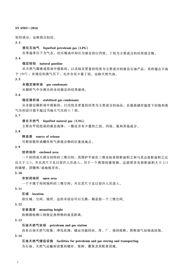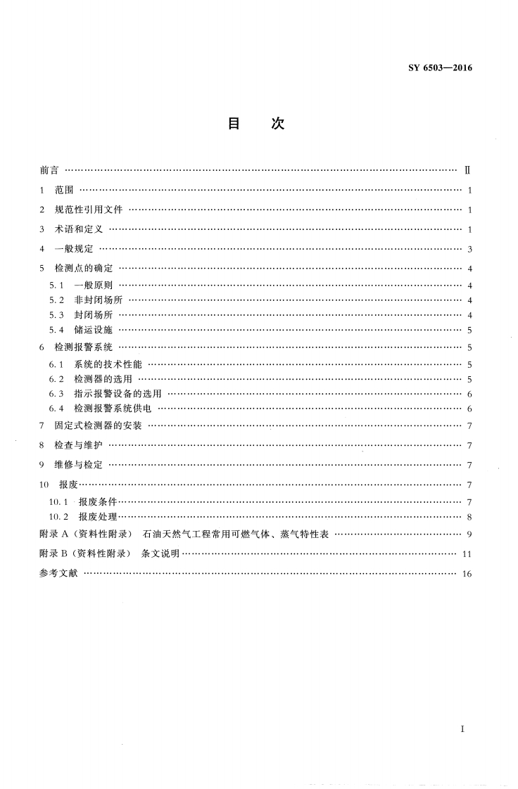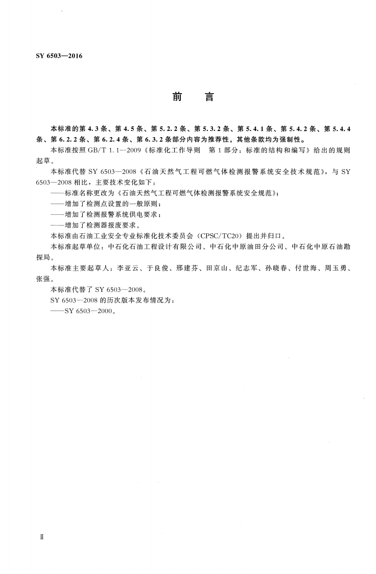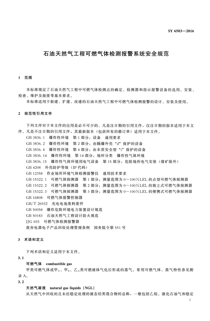 ICS13.100E09备案号:53361一2016SY中华人民共和国石油天然气行业标准SY6503-2016代替SY6503—2008石油天然气工程可燃气体检测报警系统安全规范Safety specification of combustible gas detection and alarm systemfor petroleum and natural gas engineering2016-01-07发布2016一06一01实施国家能源局发布