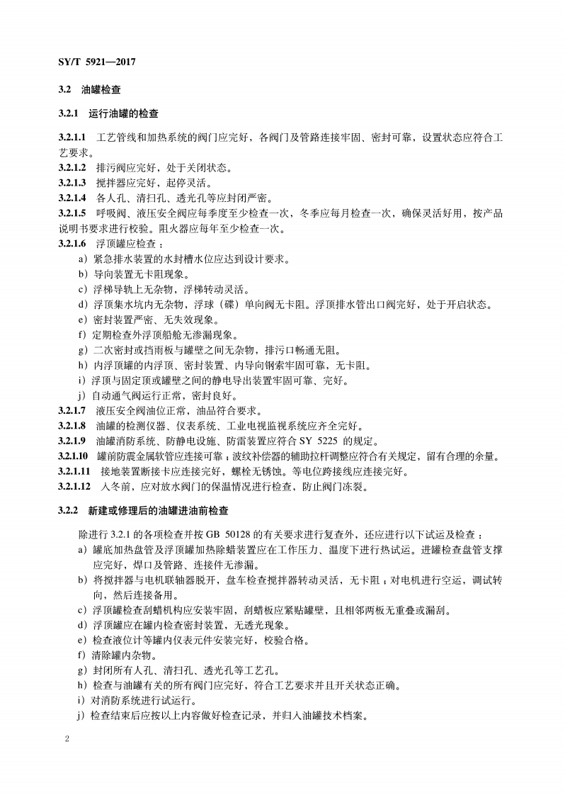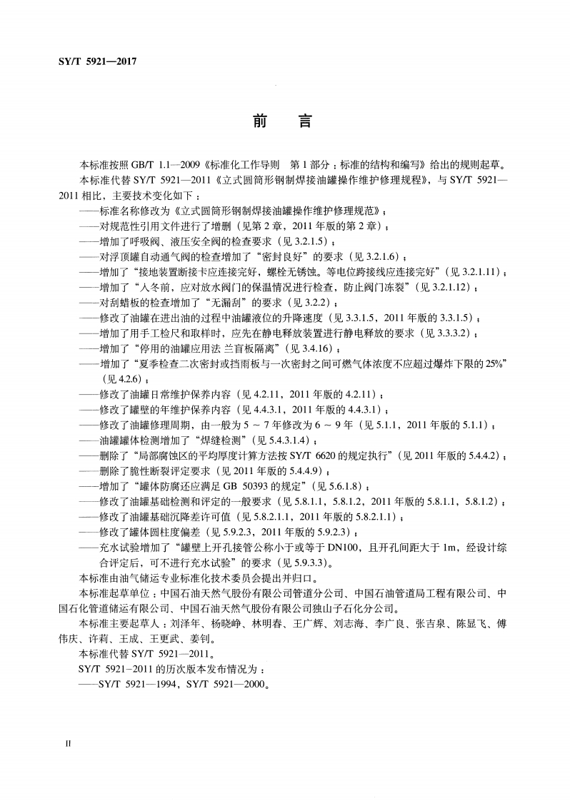 ICS75.200E16备案号:60718一2018SY中华人民共和国石油天然气行业标准SYT5921-2017代替SYT5921-2011立式圆筒形钢制焊接油罐操作维护修理规范Specification for operating,maintenance and repairof vertical cylindrical welded steel oil tank2017-11-15发布2018-03-01实施国家能源局发布