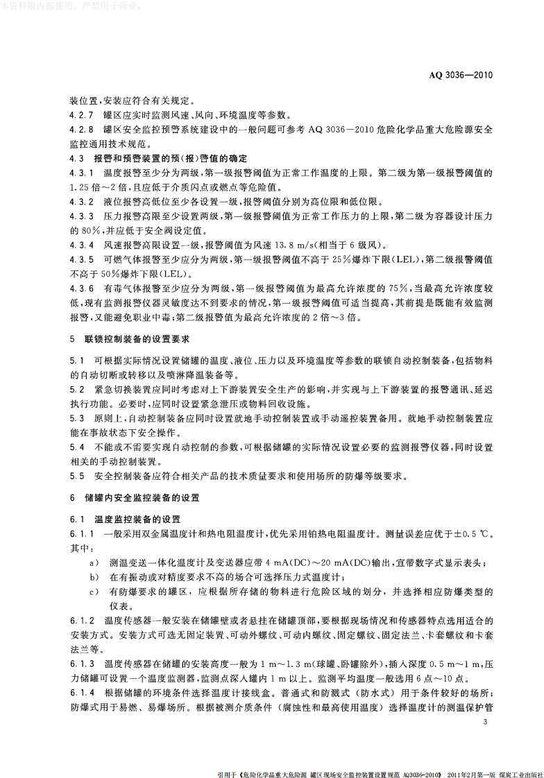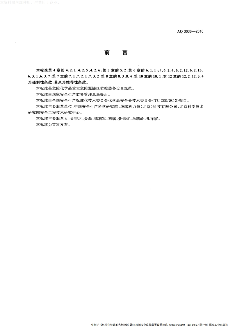 本资料限内部使用,严禁用于商业1CS13.320C66备案号:29852一2010AQ中华人民共和国安全生产行业标准AQ3036-2010危险化学品重大危险源罐区现场安全监控装备设置规范Setting specifications for safety monitoring and controlling equipments indangerous chemicals major hazard installations Tanks section2010-09-06发布2011-05-01实施国家安全生产监督管理总局发布010】201业出版