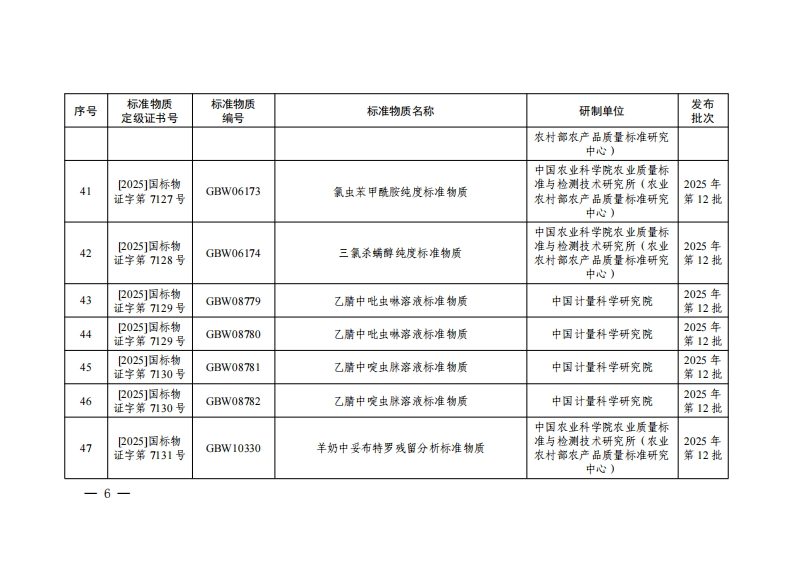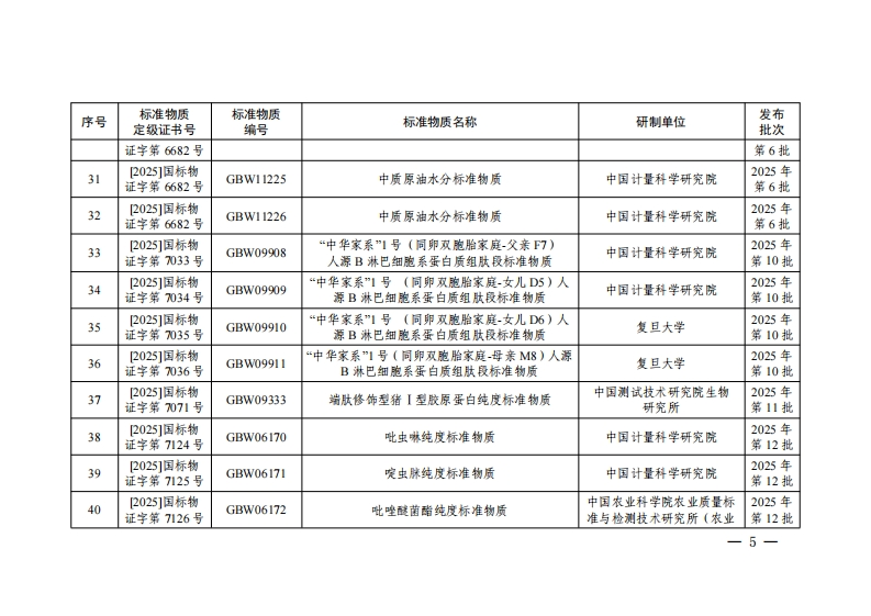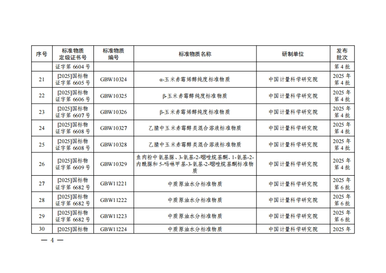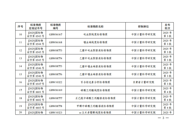 2025年批准新建国家一级标准物质日录序号标准物质标准物质标准物质名称研制单位发布定级证书号编号批次2025年12025]国标物证字第6403号GBW09325L-甲状腺素纯度标准物质中国计量科学研究院第1批2025]国标物证字第6404号GBW09326三碘代-L甲状腺原氨酸纯度标准物质中国计量科学研究院2025年第1批2025]国标物陕西省地质矿产实验研究所2025年3证字第6457号GBW07493a黄土土壤有效态成分分析标准物质有限公司第1批[2025]国标物CDN2 ARARB2 RASSFLA/SHOX2基因启动子区2025年4证字第7609号GBW09327城甲基化(5'甲基胞嘧啶)质粒DNA标准物质中国计量科学研究院第2批2025]国标物CDN2 VRARB.2 RASSFLA/SHOX2基因启动子区2025年5证字第7609号GBW09328城甲基化(5'甲基胞密啶)质粒DNA标准物质中国计量科学研究院第2批2025]国标物6证字第7609号GBW09329CDN2 ARARB2/RASSFLA/SHOX2基因启动子区城甲基化(5'甲基胞密啶)质粒DNA标准物质中国计量科学研究院2025年第2批CDN2 VRARB.2/RASSFIA/SHOX2基因启动子区2025年72025]国标物证字第7609号GBW09330城甲基化(5'.甲基胞密啶)质粒DNA标准物质中国计量科学研究院第2批2025]国标物2025年8证字第7610号GBW09331EGFR基因突变(I9DEL)基因组DNA标准物质中国计量科学研究院第2批92025]国标物EGR基因突变(T79OM和L858R)基因组DNA中国计量科学研究院2025年证字第7611号GBW09332标准物质第2批2