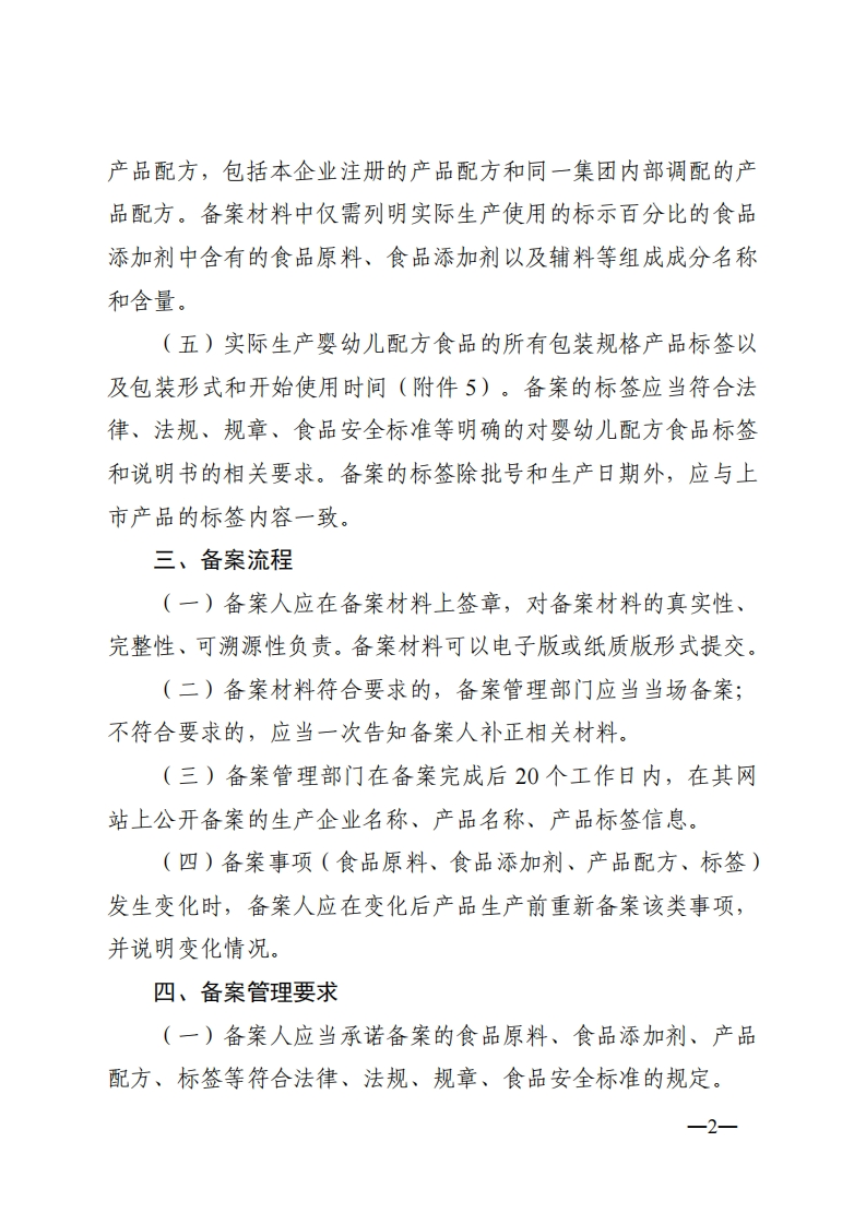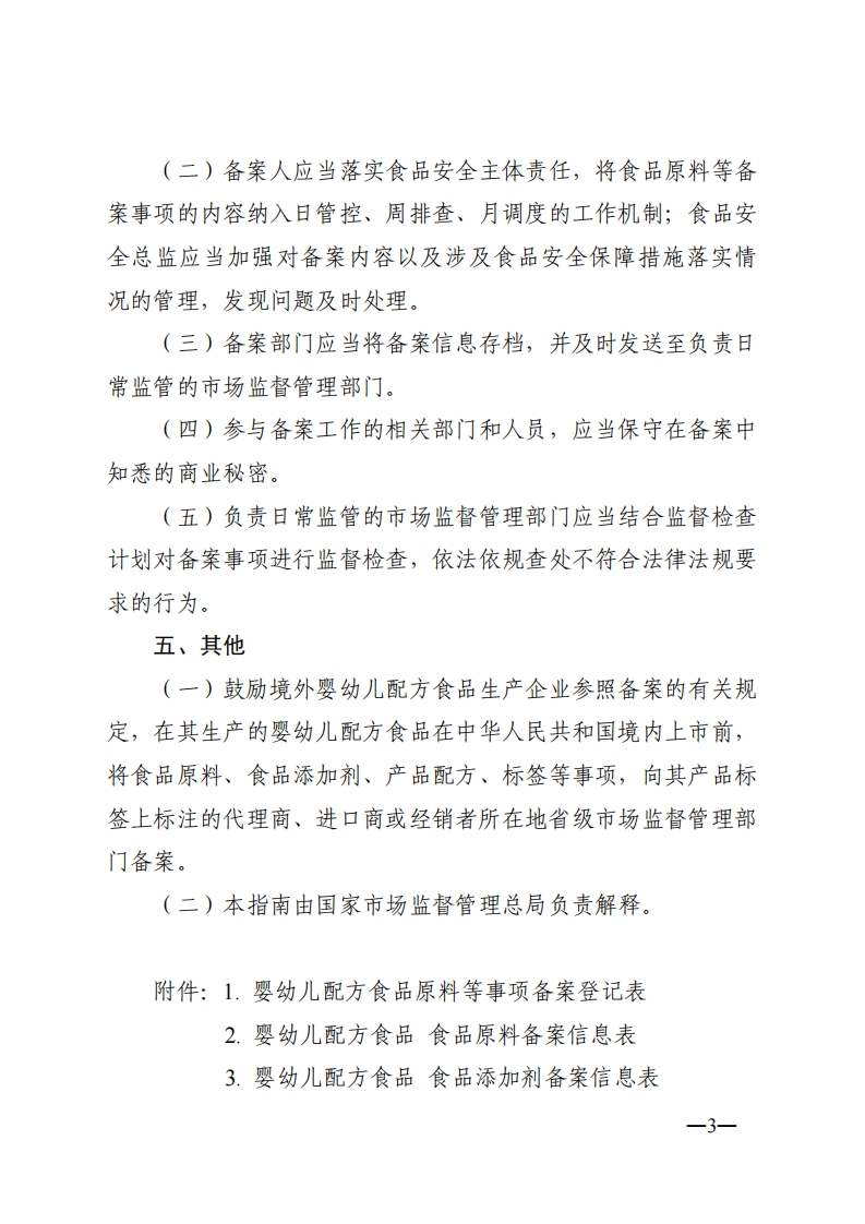 婴幼儿配方食品原料等事项备案工作指南为进一步指导婴幼儿配方食品原料等事项备案管理工作,保障婴幼儿配方食品质量安全,根据《中华人民共和国食品安全法》及其实施条例,制定本指南。一、备案主体备案人为拟在中华人民共和国境内生产并销售婴幼儿配方食品的生产企业。二、备案内容备案人在其生产婴幼儿配方食品前,将下列材料向所在地省级市场监督管理部门备案。(一)婴幼儿配方食品原料等事项备案登记表,以及备案人对提交材料真实性负责的法律责任承诺书(附件1)。(二)采购使用的食品原料名称、品牌、产地/国别、包装规格、质量要求/原料执行标准号、供应商名称、生产商名称和使用该食品原料的产品配方注册证号(附件2)。(三)采购使用的食品添加剂名称、品牌、产地/国别、包装规格、质量要求/食品添加剂执行标准号、供应商名称、生产商名称和使用该食品添加剂的产品配方注册证号(附件3)。(四)实际生产婴幼儿配方食品的产品配方组成及用量(附件4)。备案的产品配方为婴幼儿配方食品生产企业实际生产的一1