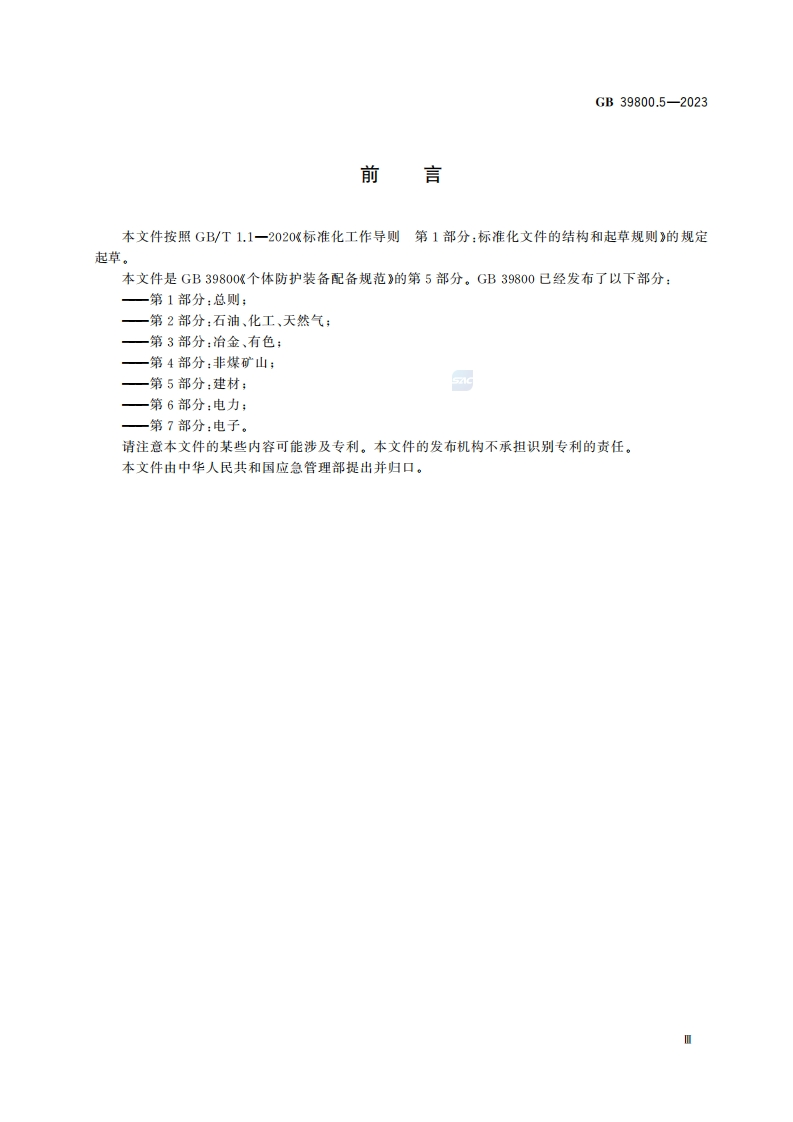 ICs13.340.01CCS C 73中华人民共和国国家标准GB39800.5-2023个体防护装备配备规范第5部分:建材Specifications for the provision of personal protective equipment-Part 5:Building materials industry国家标准全文公开系统专用,此文本仅供个人学习、研究之用,未经授权,禁止复制、发行、汇编、翻译或网铬传播等,侵权必究全国标准信息公共服务平台:https:/std.samr.gow.cam2023-12-28发布2025-01-01实施国家市场监督管理兽局发布国家标准化管理委员会