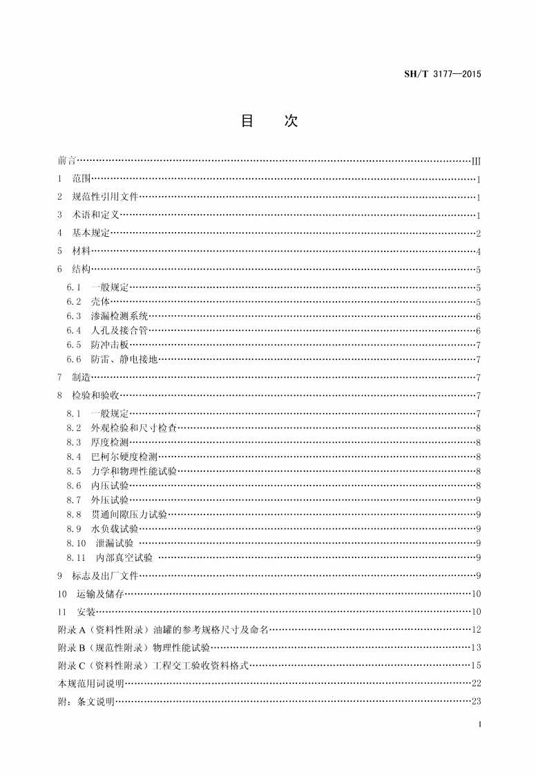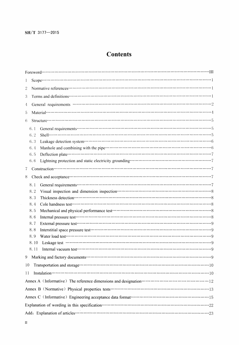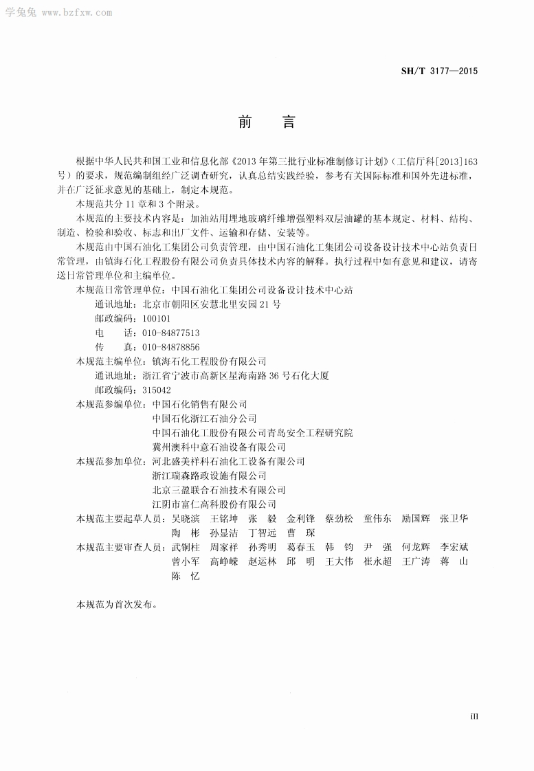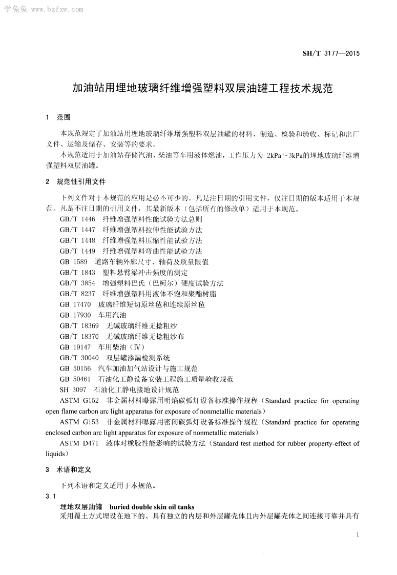 1CS75.200P72备案号:J2094-2015SH中华人民共和国石油化汇行业标准SH/T3177-2015加油站用埋地玻璃纤维增强塑料双层油罐工程技术规范Technical specification for buried glass fiber reinforcedplastic double skin oil tanks in fuel filling station名5心2015-04-30发布2015-05-01实施中华人民共和国工业和信息化部发布