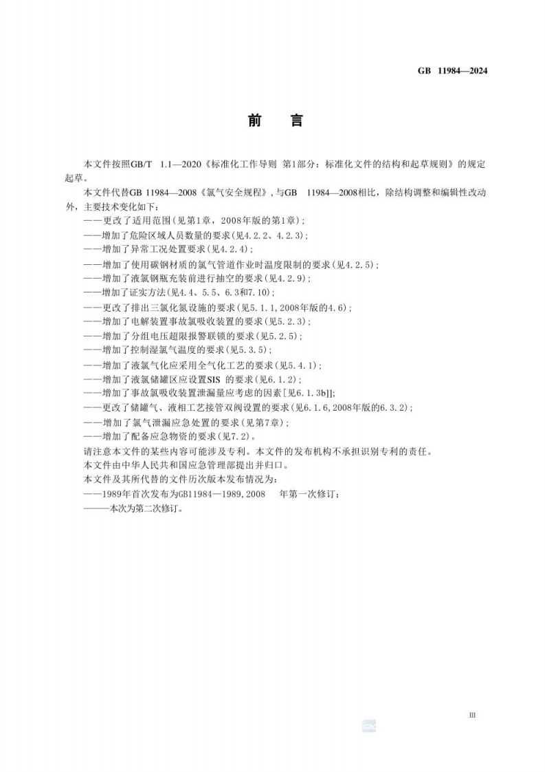 化工企业氯气安全技术规范Technicalspecificationforchlorinesafetyofchemicalindustrialenterprises348072@abc5天前发布关注私信1.20MB10页035化工企业氯气安全技术规范Technicalspecificationforchlorinesafetyofchemicalindustrialenterprises此内容为付费资源,请付费后查看¥19¥29黄金会员免费钻石会员免费立即购买您当前未登录!建议登陆后购买,可保存购买订单付费资源 第1页 / 共10页 第2页 / 共10页 第3页 / 共10页 第4页 / 共10页 第5页 / 共10页 试读已结束,还剩5页,您可下载完整版后进行离线阅读 THE END标准规范 文本预览 1CS13300CCS G 09gB中华人民共和国国家标准GB11984-2024代替GB11984-2008化工企业氯气安全技术规范Technical specification for chlorine safety of chemical industrial enterprises园2024-11-28发布2025-08-01实施国家市场监督管理总局国家标准化管理委员会发布 查看更多 收起部分 喜欢就支持一下吧收藏