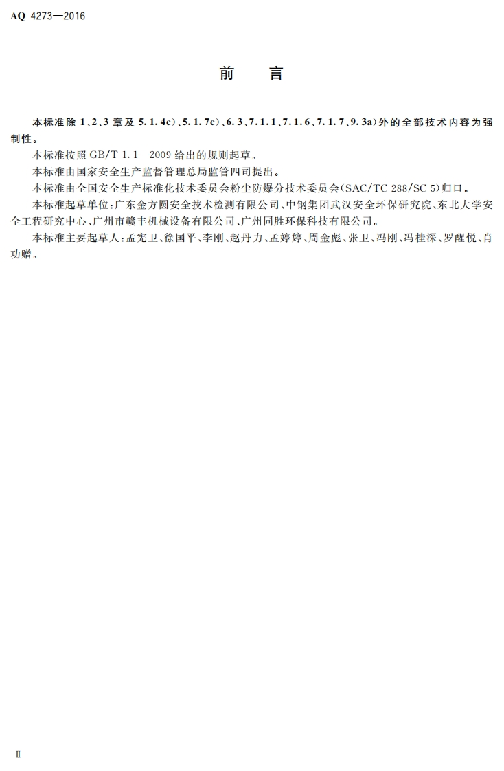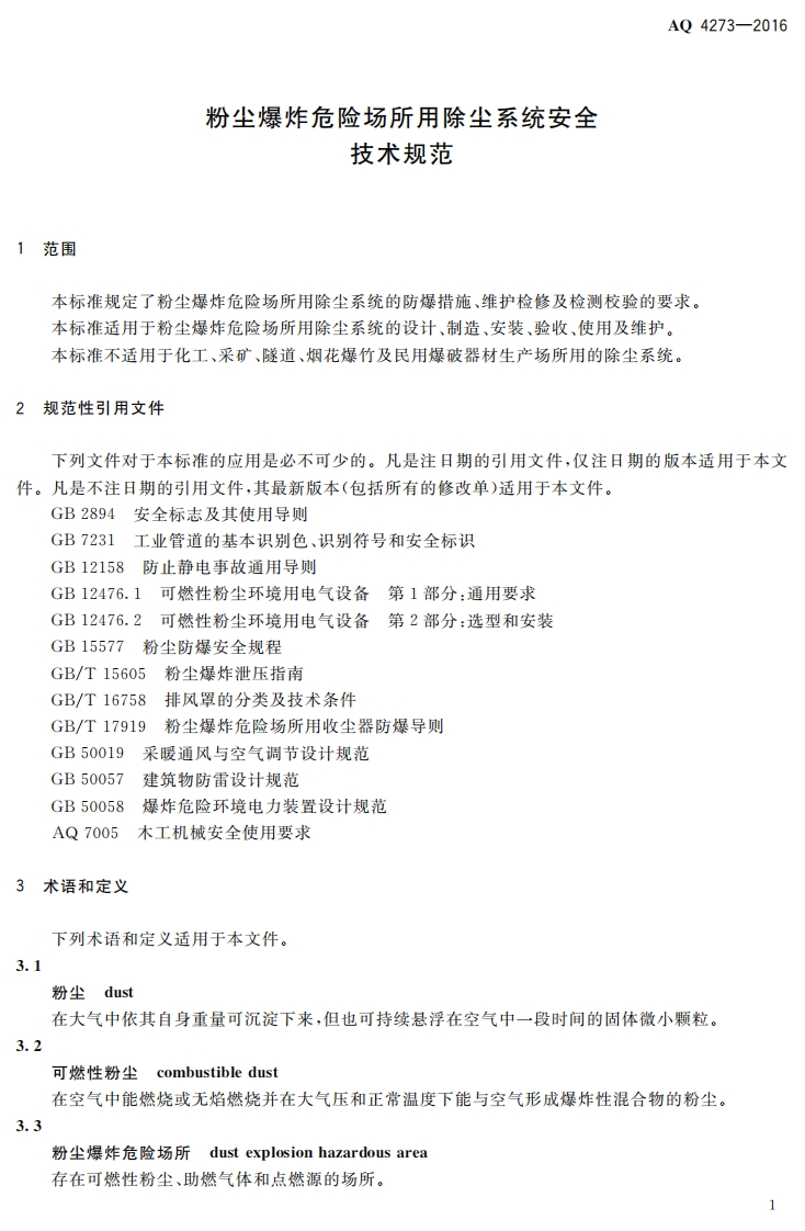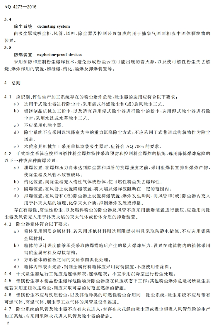 尘爆炸危险场所用除尘系统安全技术规范Safetyspecificationsfordedustingsystemusedindustexplosionhazardousarea348072@abc4天前发布关注私信1.25MB13页042尘爆炸危险场所用除尘系统安全技术规范Safetyspecificationsfordedustingsystemusedindustexplosionhazardousarea此内容为付费资源,请付费后查看¥19¥29黄金会员免费钻石会员免费立即购买您当前未登录!建议登陆后购买,可保存购买订单付费资源 第1页 / 共13页 第2页 / 共13页 第3页 / 共13页 第4页 / 共13页 第5页 / 共13页 试读已结束,还剩8页,您可下载完整版后进行离线阅读 THE END标准规范 文本预览 1CS13.100C65备案号:56078一2016AQ中华人民共和国安全生产行业标准AQ4273-2016粉尘爆炸危险场所用除尘系统安全技术规范Safety specifications for dedusting system used in dustexplosion hazardous area2016-08-29发布2017-03-01实施国家安全生产监督管理总局发布 查看更多 收起部分 喜欢就支持一下吧收藏