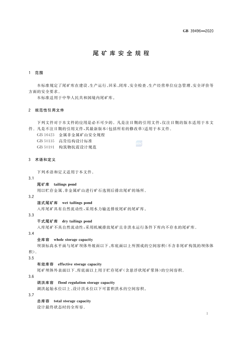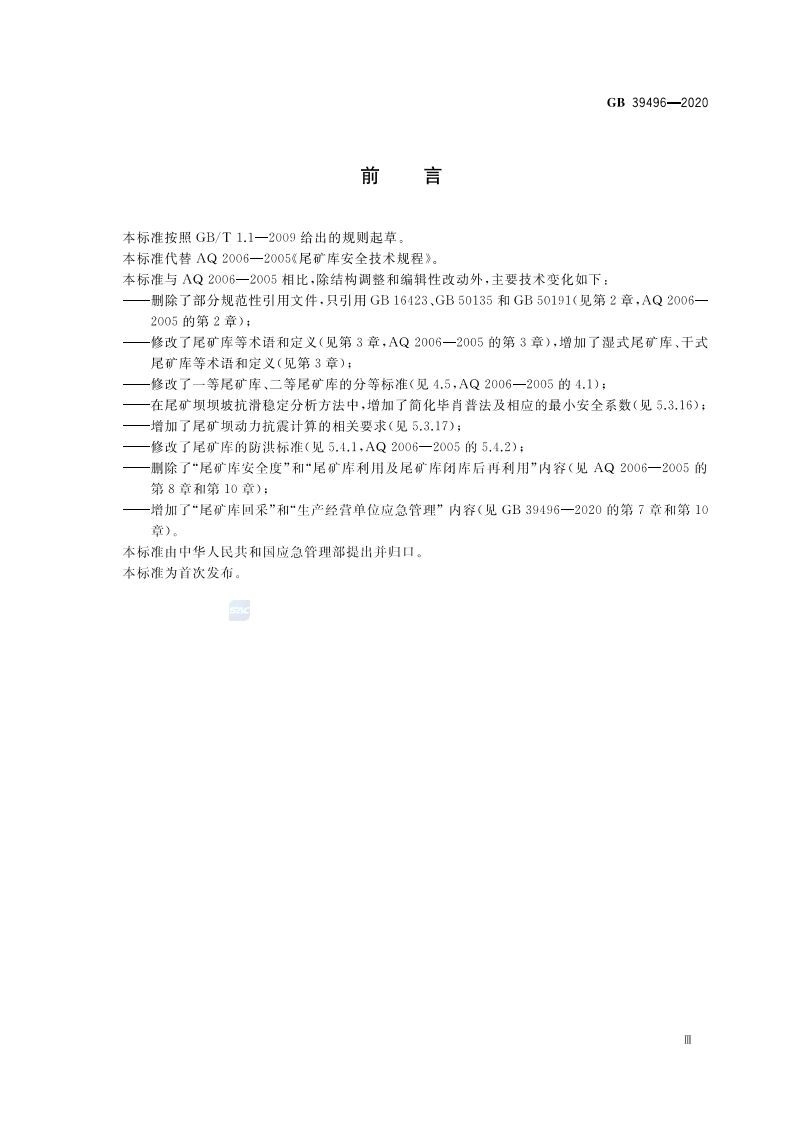 尾矿库安全规程Safetyregulationfortailingspond348072@abc4天前发布关注私信9.34MB30页038尾矿库安全规程Safetyregulationfortailingspond此内容为付费资源,请付费后查看¥19¥29黄金会员免费钻石会员免费立即购买您当前未登录!建议登陆后购买,可保存购买订单付费资源 第1页 / 共30页 第2页 / 共30页 第3页 / 共30页 第4页 / 共30页 第5页 / 共30页 试读已结束,还剩25页,您可下载完整版后进行离线阅读 THE END标准规范 文本预览 ICS 73Z61GB中华人民共和国国家标准GB39496—2020代替AQ2006一2005尾矿库安全规程Safety regulation for tailings pond2020-10-11发布2021-09-01实施国家市场监督管理总局国家标准化管理委员会发布 查看更多 收起部分 喜欢就支持一下吧收藏