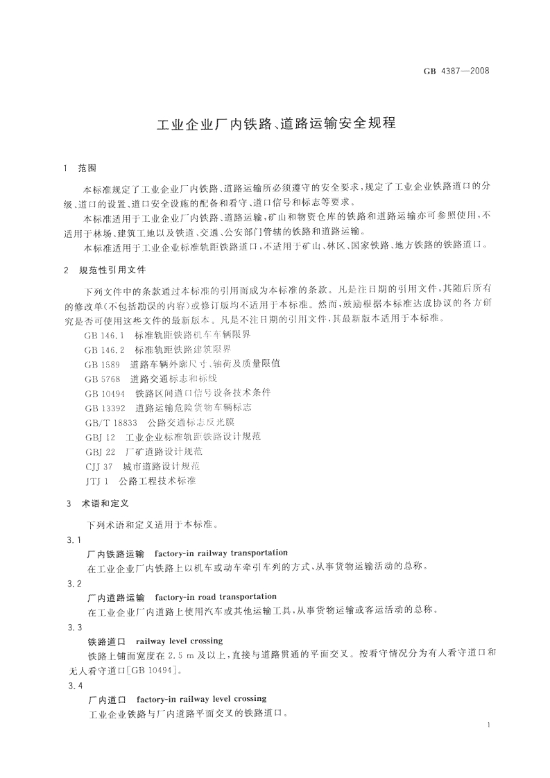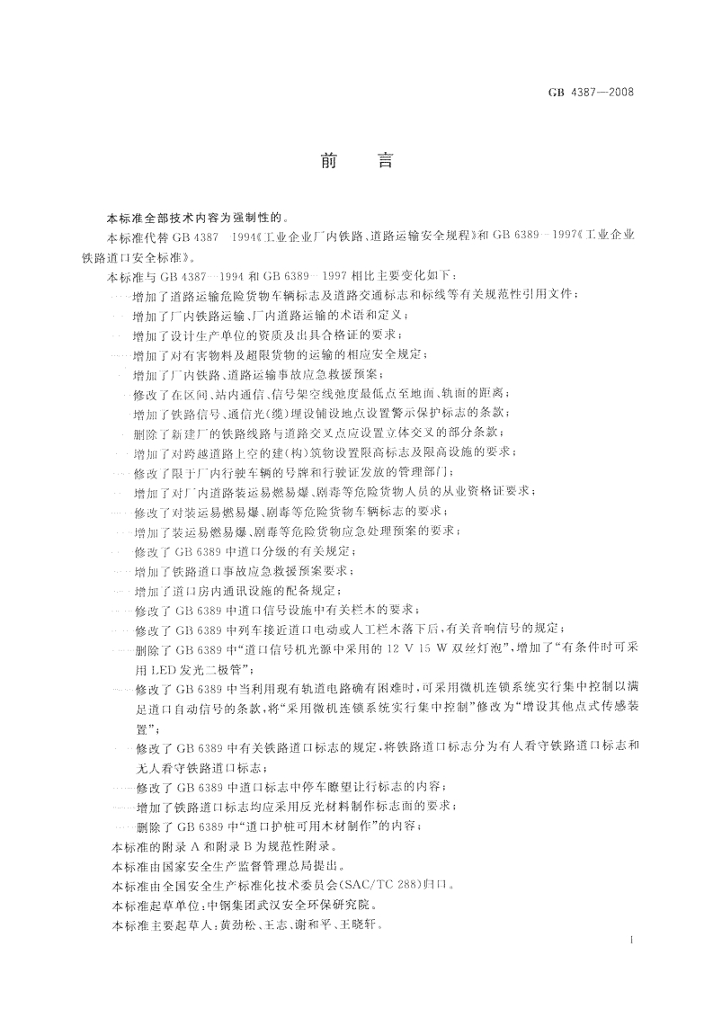 ICS13.100C66中华人民共和国国家标准GB4387-2008代替GB4387·1994,GB63891997工业企业厂内铁路、道路运输安全规程Safety regulation for railway and road transportationin plants of industrial enterprises2008-12-11发布2009-10-01实施中华人民共和国国家质量监督检验检疫总局中国国家标准化管理委员会发布