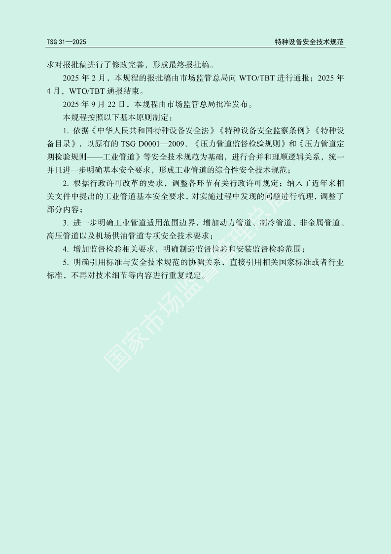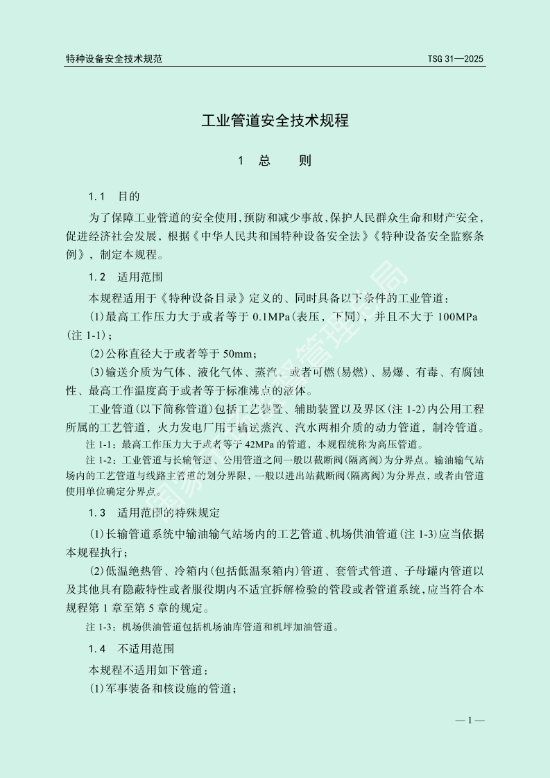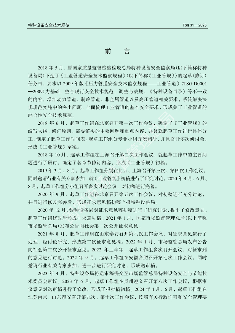 工业管道安全技术规程SafetyTechnologyRegulationforIndustrialPressurePipe348072@abc4天前发布关注私信37.35MB90页036工业管道安全技术规程SafetyTechnologyRegulationforIndustrialPressurePipe此内容为付费资源,请付费后查看¥19¥29黄金会员免费钻石会员免费立即购买您当前未登录!建议登陆后购买,可保存购买订单付费资源 第1页 / 共90页 第2页 / 共90页 第3页 / 共90页 第4页 / 共90页 第5页 / 共90页 试读已结束,还剩85页,您可下载完整版后进行离线阅读 THE END标准规范 文本预览 TSG特种设备安全技术规范TSG31-2025工业管道安全技术规程Safety Technology Regulation for Industrial Pressure Pipe国家市场监督管理总局发布2025年9月22日 查看更多 收起部分 喜欢就支持一下吧收藏