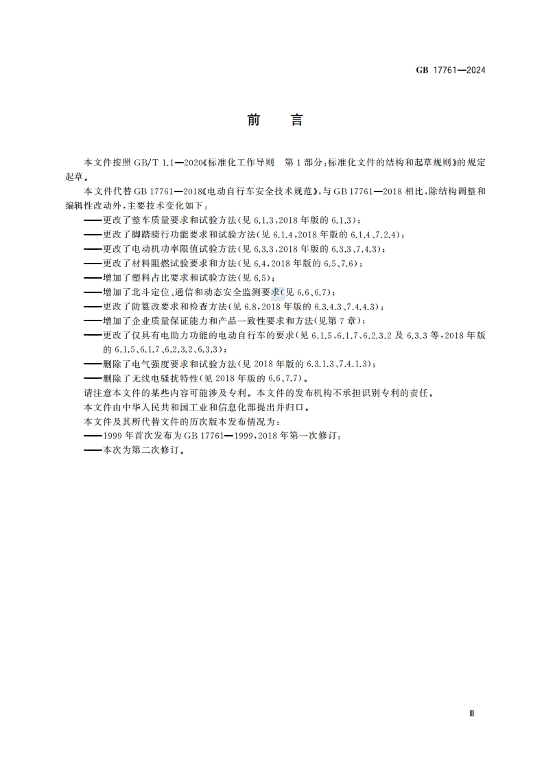 电动自行车安全技术规范Safetytechnicalspecificationforelectricbicycle348072@abc4天前发布关注私信1.03MB43页025电动自行车安全技术规范Safetytechnicalspecificationforelectricbicycle此内容为付费资源,请付费后查看¥19¥29黄金会员免费钻石会员免费立即购买您当前未登录!建议登陆后购买,可保存购买订单付费资源 第1页 / 共43页 第2页 / 共43页 第3页 / 共43页 第4页 / 共43页 第5页 / 共43页 试读已结束,还剩38页,您可下载完整版后进行离线阅读 THE END标准规范 文本预览 ICS43.140CCS Y 14中华人民共和国国家标准GB17761-2024代替GB17761一2018四电动自行车安全技术规范Safety technical specification for electric bicycle2024-12-31发布2025-09-01实施国家市场监督管理兽局发布国家标准化管理委员会 查看更多 收起部分 喜欢就支持一下吧收藏