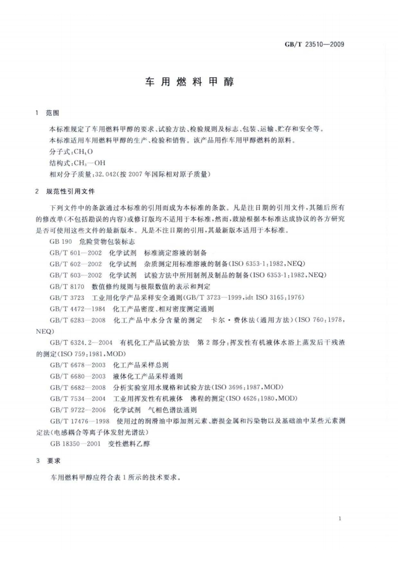 车用燃料甲醇Fuelmethanolformotorvehicles348072@abc3天前发布关注私信1.33MB12页050车用燃料甲醇Fuelmethanolformotorvehicles此内容为付费资源,请付费后查看¥19¥29黄金会员免费钻石会员免费立即购买您当前未登录!建议登陆后购买,可保存购买订单付费资源 第1页 / 共12页 第2页 / 共12页 第3页 / 共12页 第4页 / 共12页 第5页 / 共12页 试读已结束,还剩7页,您可下载完整版后进行离线阅读 THE END标准规范 文本预览 1CS71.080.60G16GB中华人民共和国国家标准GB/T23510-2009车用燃料甲醇Fuel methanol for motor vehicles2009-04-08发布2009-11-01实施中华人民共和国国家质量监督检验检疫总局数码防伪中国国家标准化管理委员会发布 查看更多 收起部分 喜欢就支持一下吧收藏