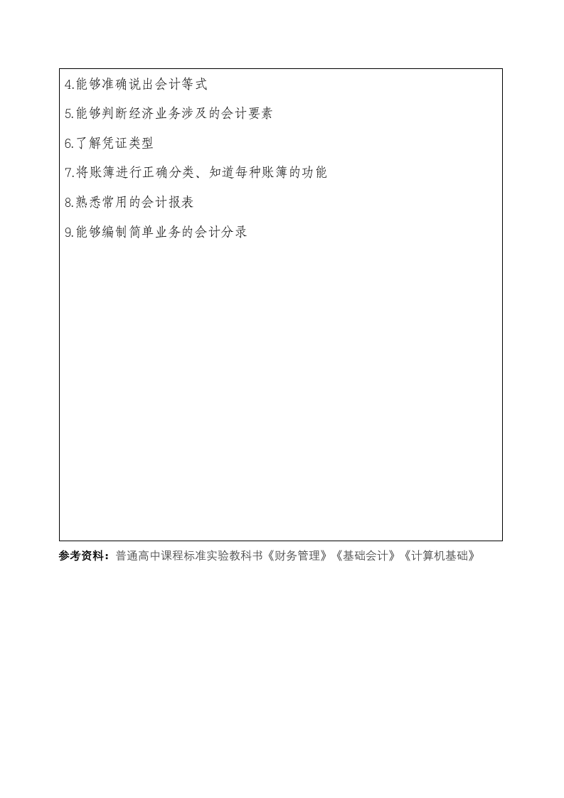 云南农业职业技术学院2022年单独招生财会类考试大纲考生类别:三校生应(往)届毕业生参加测试的专业:大数据与财务管理、行政管理、市场营销、现代农业经济管理、会计信息管理考核方式:文化素质(200分)+职业技能考核(200分)】测试大纲(要点):一、三校生文化素质:(200分)考试科目为:语文、数学、英语、政治,共计四科、总分200分。网络远程测试(电脑、移动设备在线答题)。考试时间:以系统计时为准。二、职业技能考核(200分)网络远程测试(电脑、移动设备在线答题),共计200分。考试时间:以系统计时为准。考试范围:1.职业意识考生对专业的了解程度、职业性质、适应职业岗位、选择适合自己的职业的能力、职业价值观等。2.职业素养考生职业理想、基本职业道德规范、竞争上岗的意识与能力。职场礼仪、沟通、协作能力。自我分析、情绪管理、时间管理与职业规划能力等。3.职业技能:1.能够辨别真伪钞票2.能够列举会计六大要素3.能够正确书写金额大小写