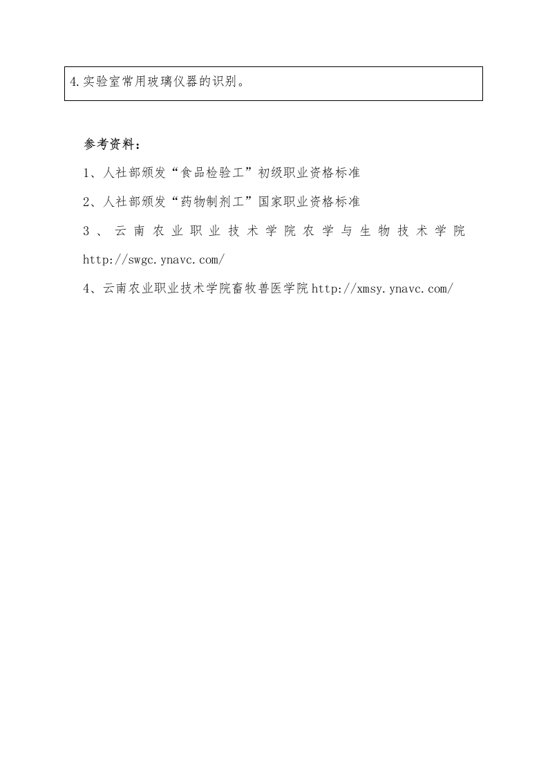 云南农业职业技术学院2022年单独招生食品药品类考试大纲考生类别:三校生应(往)届毕业生参加测试的专业:农产品加工与质量检测、食品检验检测技术、药品生产技术、药品经营与管理、食品质量与安全考核方式:文化素质口试(200分)+职业技能考核(200分)测试大纲(要点):一、三校生文化素质:(200分)考试科目为:语文、数学、英语、政治,共计四科、总分200分。网络远程测试(电脑、移动设备在线答题)。考试时间:以系统计时为准。二、职业技能考核(200分)网络远程测试(电脑、移动设备在线答题),共计200分。考试时间:以系统计时为准。考试范围:1.职业意识考生对专业的了解程度、职业性质、适应职业岗位、选择适合自己的职业的能力、职业价值观等。2.职业素养考生职业理想、基本职业道德规范、竞争上岗的意识与能力。职场礼仪、沟通、协作能力。自我分析、情绪管理、时间管理与职业规划能力等。3.职业技能:1.假冒伪劣食品药品的危害性;2.常见食品的识别;3.能写出几种常见药品中文名;