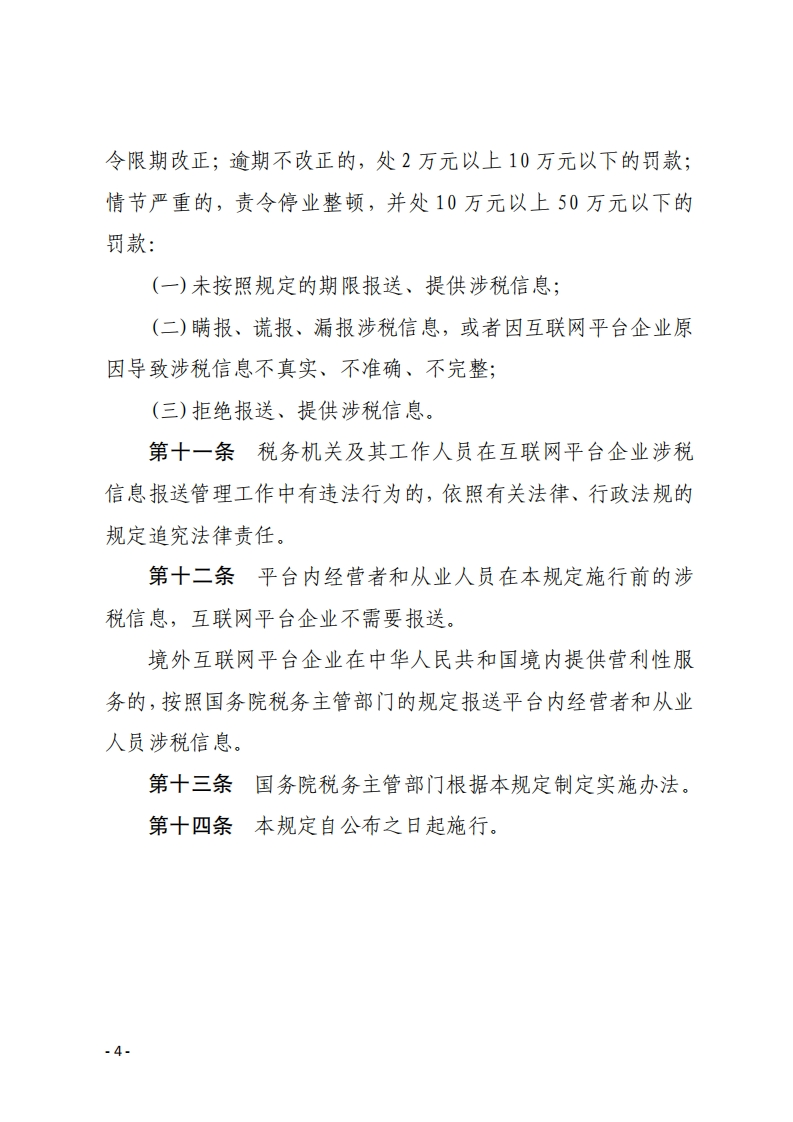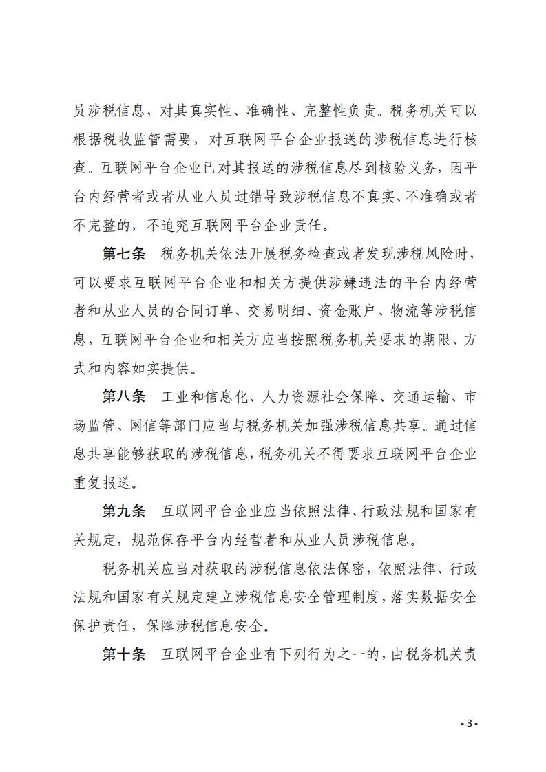 互联网平台企业涉税信息报送规定(2025年6月13日国务院第61次常务会议通过2025年6月20日中华人民共和国国务院令第810号公布自公布之日起施行)第一条为了规范互联网平台企业向税务机关报送平台内经营者和从业人员涉税信息,提升税收服务与管理效能,保护纳税人合法权益,营造公平统一的税收环境,促进平台经济规范健康发展,根据《中华人民共和国税收征收管理法》、《中华人民共和国电子商务法》,制定本规定。第二条互联网平台企业应当依照本规定向其主管税务机关报送平台内经营者和从业人员的身份信息、收入信息等涉税信息。本规定所称互联网平台企业,是指《中华人民共和国电子商务法》规定的电子商务平台经营者以及其他为网络交易活动提供网络经营场所、交易撮合、信息发布等营利性服务的法人或者非法人组织;所称从业人员,是指通过互联网平合以个人名义提供营利性服务的自然人。-1-
