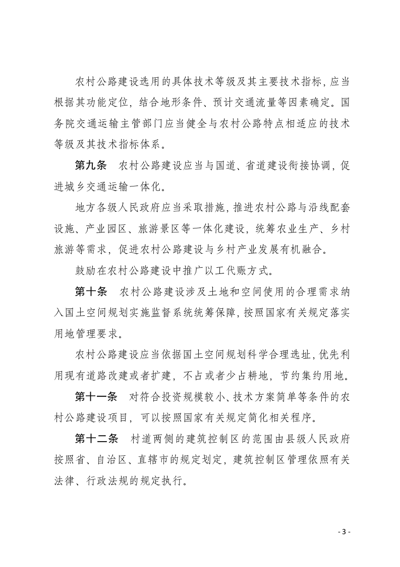 农村公路条例(2025年6月27日国务院第62次常务会议通过2025年7月16日中华人民共和国国务院令第813号公布自2025年9月15日起施行)第一条为了推动农村公路高质量发展,适应推进乡村全面振兴、加快农业农村现代化需要,制定本条例。第二条本条例所称农村公路,包括县道、乡道和村道。第三条农村公路是服务农业、农村、农民的公益性基础设施。国家综合采取多方面措施,支持和促进农村公路发展。第四条农村公路发展应当贯彻党和国家路线方针政策、决策部署,与统筹新型城镇化和乡村全面振兴的有关要求相适应,坚持政府主导、统筹规划、因地制宜,坚持建设、管理、养护、运营并重,逐步完善全域覆盖、普惠共享、安全适用、便捷高效的农村交通基础设施网络。第五条县级人民政府对本行政区域内农村公路发展承担主体责任,加强对农村公路工作的组织领导,落实农村公路发展支持措施,统筹研究和协调解决农村公路工作中的重大问题。-1-