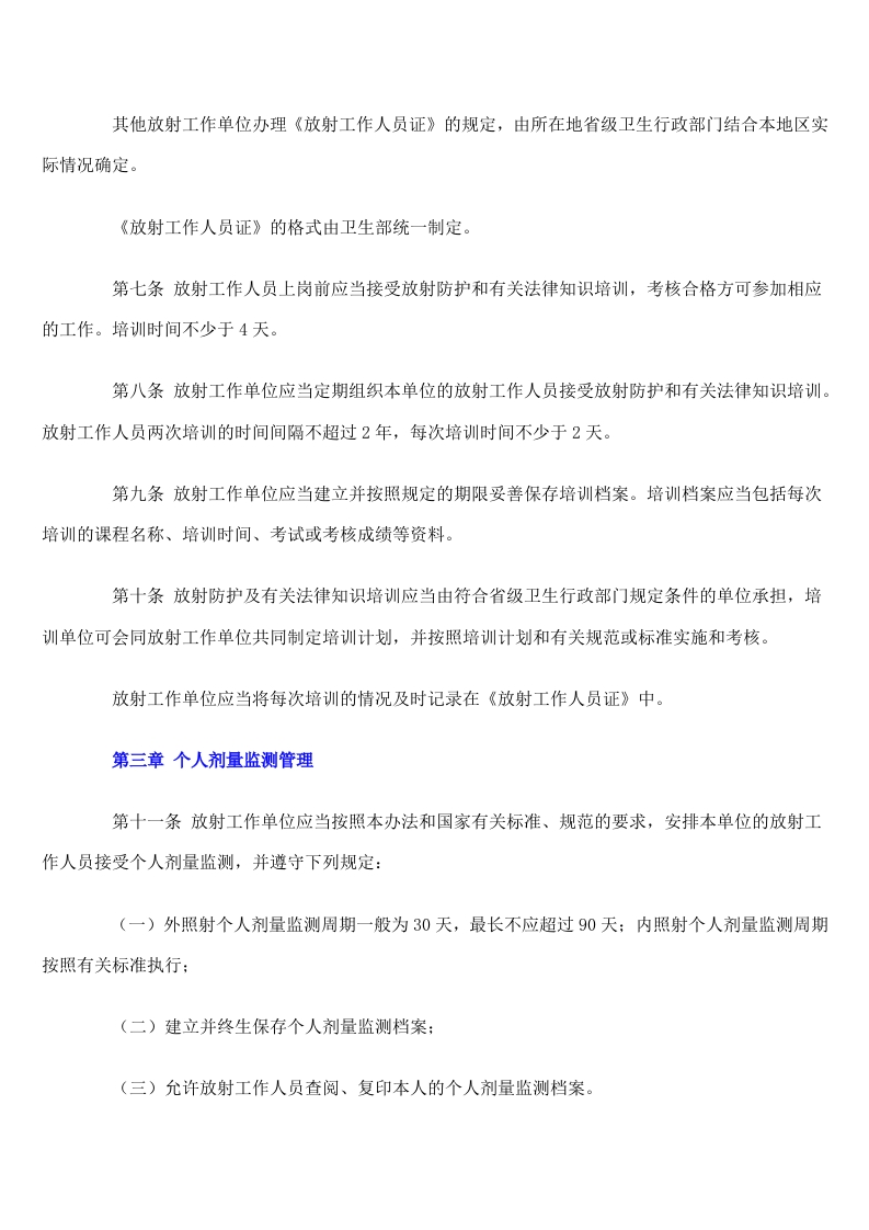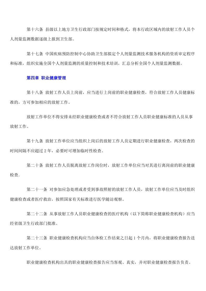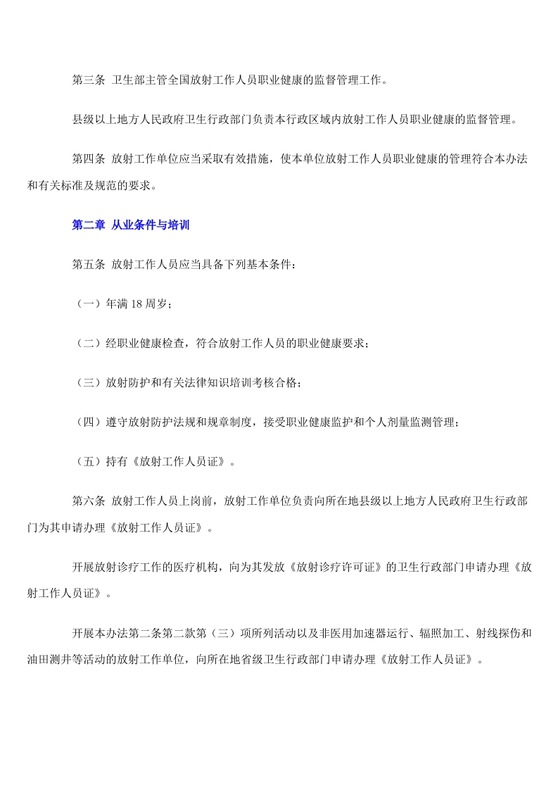 放射工作人员职业健康管理办法中华人民共和国卫生部令第55号《放射工作人员职业健康管理办法》已于2007年3月23日经卫生部部务会议讨论通过,现予以发布,自2007年11月1日起施行。二OO七年六月三日第一章总则第一条为了保障放射工作人员的职业健康与安全,根据《中华人民共和国职业病防治法》(以下简称《职业病防治法》)和《放射性同位素与射线装置安全和防护条例》,制定本办法。第二条中华人民共和国境内的放射工作单位及其放射工作人员,应当遵守本办法。本办法所称放射工作单位,是指开展下列活动的企业、事业单位和个体经济组织:(一)放射性同位素(非密封放射性物质和放射源)的生产、使用、运输、贮存和废弃处理:(二)射线装置的生产、使用和维修:(三)核燃料循环中的铀矿开采、铀矿水治、铀的浓缩和转化、燃料制造、反应堆运行、燃料后处理和核燃料循环中的研究活动:(四)放射性同位素、射线装置和放射工作场所的辐射监测:(五)卫生部规定的与电离辐射有关的其他活动。本办法所称放射工作人员,是指在放射工作单位从事放射职业活动中受到电离辐射照射的人员。