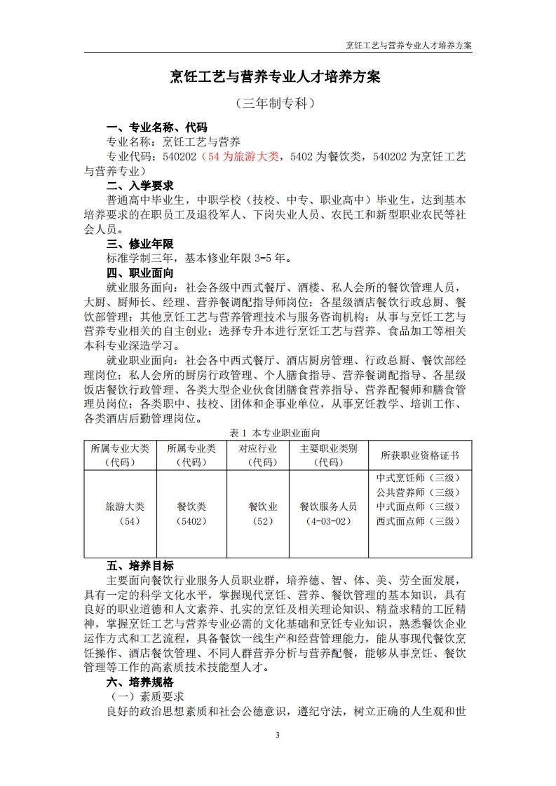烹饪工艺与营养专业人才培养方案_4348072@abc16小时前发布关注私信0.66MB39页050烹饪工艺与营养专业人才培养方案_4此内容为付费资源,请付费后查看¥19¥29黄金会员免费钻石会员免费立即购买您当前未登录!建议登陆后购买,可保存购买订单付费资源 第1页 / 共39页 第2页 / 共39页 第3页 / 共39页 第4页 / 共39页 第5页 / 共39页 试读已结束,还剩34页,您可下载完整版后进行离线阅读 THE END标准规范 文本预览 烹饪工艺与营养专业人才培养方案(三年制专科)2022年6月 查看更多 收起部分 喜欢就支持一下吧收藏