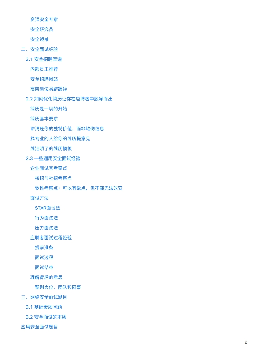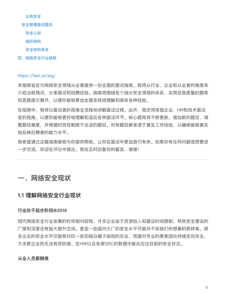 网络安全面试指南By FEEI一、网络安全现状1.1理解网络安全行业现状行业处于起步阶段@2019从业人员薪酬高从业人员良莠不齐安全水位难衡量安全建设驱动因素转变中安全圈子文化氛围浓厚学历相对不重要@20191.2安全从业人员如何选择公司业务对安全是否强诉求优先选择互联网行业甲方好于乙方,公司赚钱才能更容易高薪钱和成长兼得文化氛围至关重要岗位契合度是重中之重反向调查公司1.3安全从业人员必备素质基础:渗透测试和软件开发热情:兴趣驱动是最长久的成果:没有结果的优秀是空谈其它:优秀特质越多成长越快1.4安全从业人员能力分层业余安全爱好者安全工程师高级安全工程师安全专家高级安全专家1