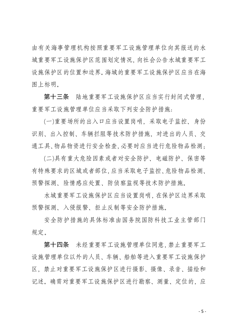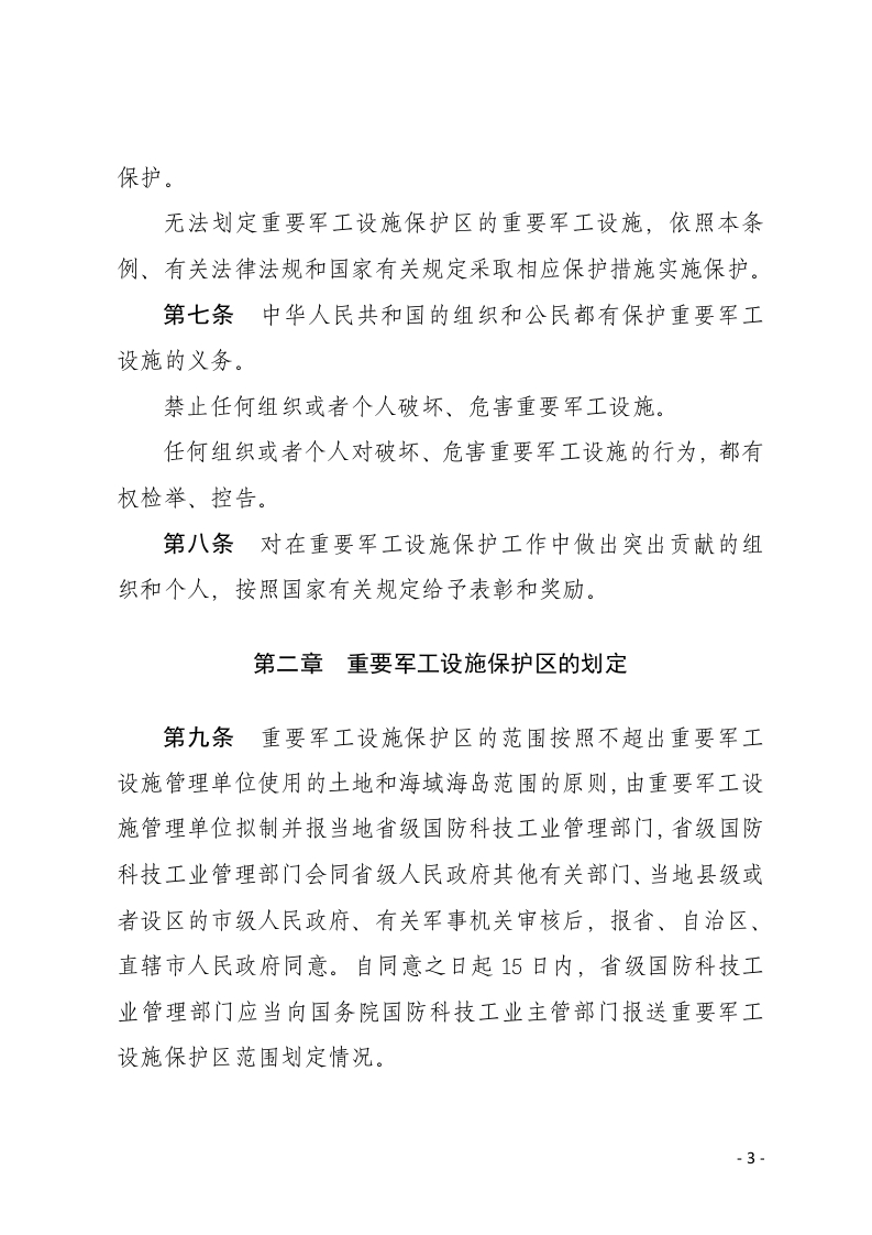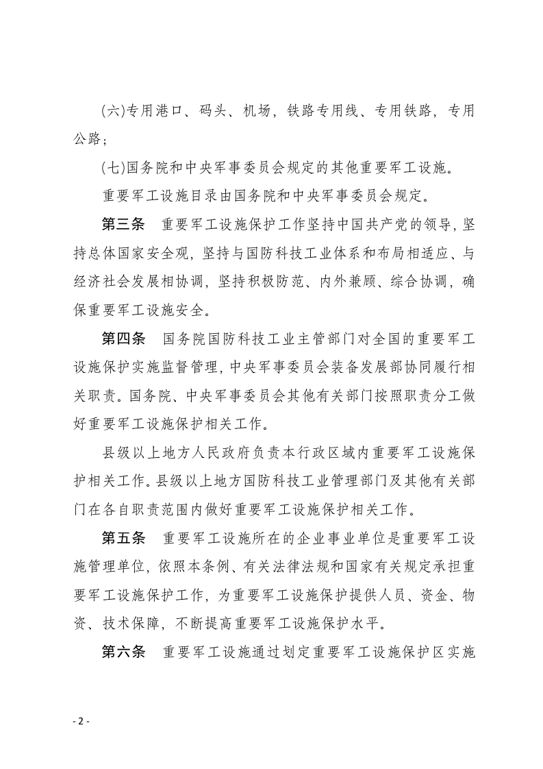 重要军工设施保护条例(2025年5月19日中华人民共和国国务院、中华人民共和国中央军事委员会令第808号公布自2025年9月15日起施行)第一章总则第一条为了保护重要军工设施的安全,保障重要军工设施的使用效能和军工科研、生产、试验、存储等活动的正常进行,加强国防现代化建设,根据《中华人民共和国国防法》、《中华人民共和国军事设施保护法》等法律,制定本条例。第二条本条例所称重要军工设施,是指承担国防科研生产任务的企业事业单位直接用于重要武器装备科研、生产、试验、存储等活动的下列建筑、场所和装置:(一)科研生产管理机构所在场所,技术研发、制造装配、维修保障场所;(二)用于试验和测试的场所、装置;(三)成品库、重大危险物品存储库;(四)档案库、通信中心、数据中心;(五)通信、观测、导航台站;-1