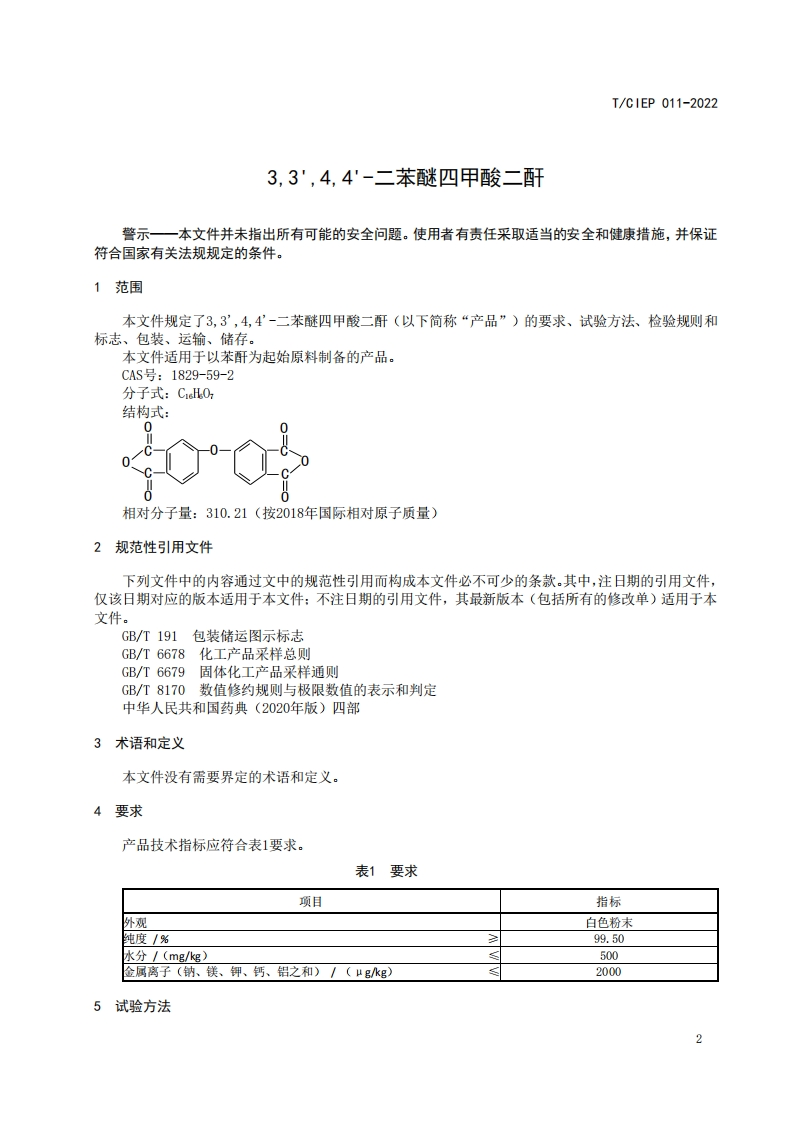 3344-二苯醚四甲酸二西3344-0xydiphthalicanhydride348072@abc3天前发布关注私信0.27MB5页0423344-二苯醚四甲酸二西3344-0xydiphthalicanhydride此内容为付费资源,请付费后查看¥19¥23黄金会员免费钻石会员免费立即购买您当前未登录!建议登陆后购买,可保存购买订单付费资源 第1页 / 共5页 第2页 / 共5页 第3页 / 共5页 第4页 / 共5页 第5页 / 共5页 已完成全部阅读,共5页 THE END标准规范 文本预览 ICS71.080.50CCS G17TCIEP团体标准T/CIEP011-20223,3',4,4'-二苯醚四甲酸二酐3,3,4,4'-Oxydiphthalic anhydride2022-06-28发布2022-07-30实施中国工业环保促进会发布 查看更多 收起部分 喜欢就支持一下吧收藏