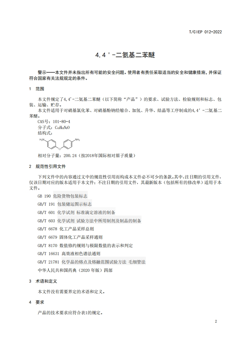 44-二氨基二苯醚44-0xydianiline348072@abc3天前发布关注私信0.37MB6页02344-二氨基二苯醚44-0xydianiline此内容为付费资源,请付费后查看¥19¥23黄金会员免费钻石会员免费立即购买您当前未登录!建议登陆后购买,可保存购买订单付费资源 第1页 / 共6页 第2页 / 共6页 第3页 / 共6页 第4页 / 共6页 第5页 / 共6页 试读已结束,还剩1页,您可下载完整版后进行离线阅读 THE END标准规范 文本预览 ICS71.080.60CCS G17/CIEP团体标准T/CIEP012-20224,4'-二氨基二苯醚4,4'-Oxydianiline2022-06-28发布2022-07-30实施中国工业环保促进会发布 查看更多 收起部分 喜欢就支持一下吧收藏
