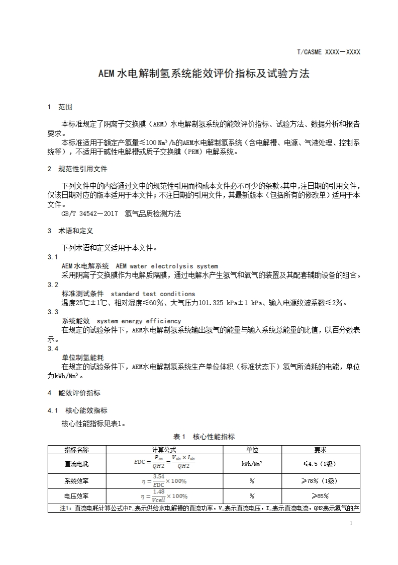 ICS点击此处添加1Cs号CCS点击此处添加CCS号T/CASME团体标准T/CASME XXXX-XXXXAEM水电解制氢系统能效评价指标及试验方法Energy efficiency evaluation indexes and test methods for AEM water electrolysishydrogen production system(征求意见稿)在提交反馈意见时,请将您知道的相联专利连同支持性文件一并附上。XXXX-XX-XX发布XXXX-XX-XX实施中国中小商业企业协会发布