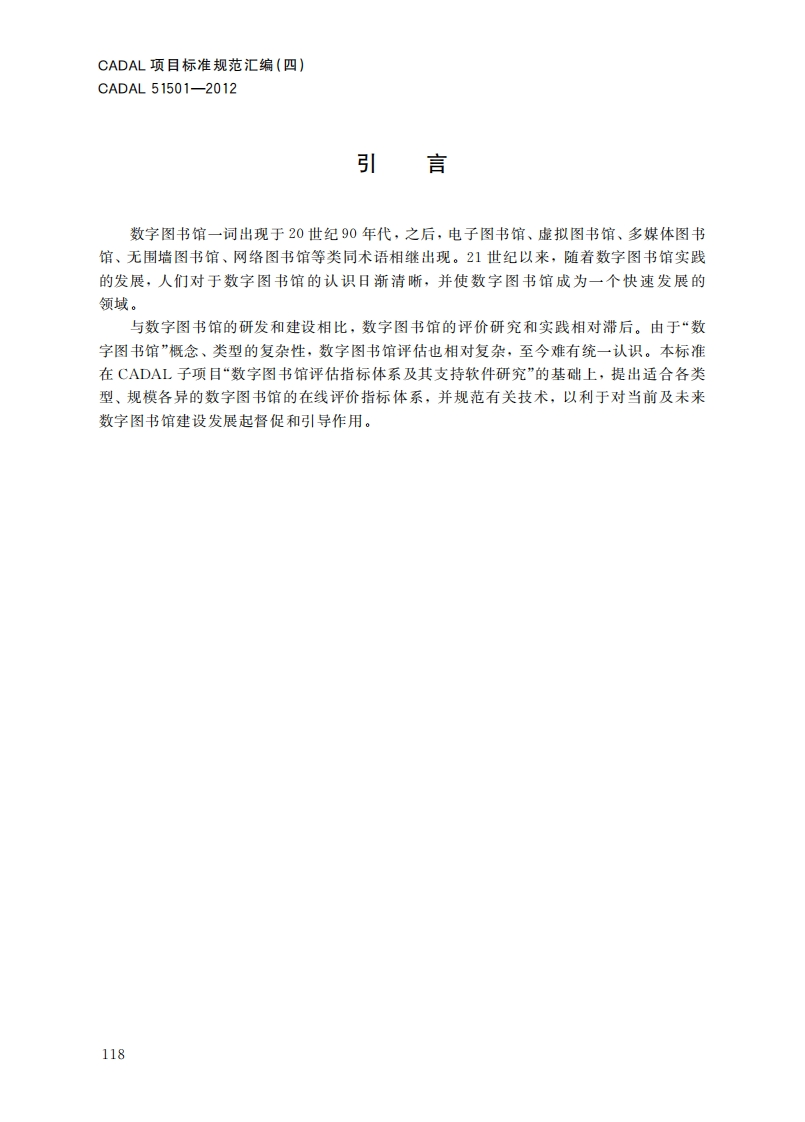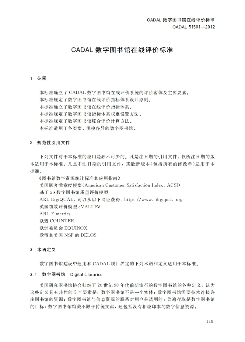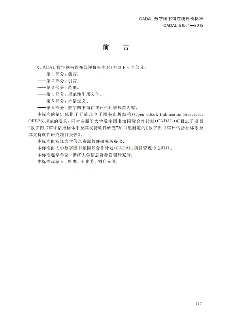 CADAL数字图书馆在线评价标准CADALOnlineEvaluationforDigitalLibraries第一稿348072@abc3天前发布关注私信0.80MB26页023CADAL数字图书馆在线评价标准CADALOnlineEvaluationforDigitalLibraries第一稿此内容为付费资源,请付费后查看¥19¥23黄金会员免费钻石会员免费立即购买您当前未登录!建议登陆后购买,可保存购买订单付费资源 第1页 / 共26页 第2页 / 共26页 第3页 / 共26页 第4页 / 共26页 第5页 / 共26页 试读已结束,还剩21页,您可下载完整版后进行离线阅读 THE END标准规范 文本预览 1CS01.140.20A14C A D A L项目标准CADAL51501-2012CADAL数字图书馆在线评价标准CADAL Online Evaluation for Digital Libraries第一稿2012-05-08发布201205-09实施CADAL项目管理中心发布 查看更多 收起部分 喜欢就支持一下吧收藏