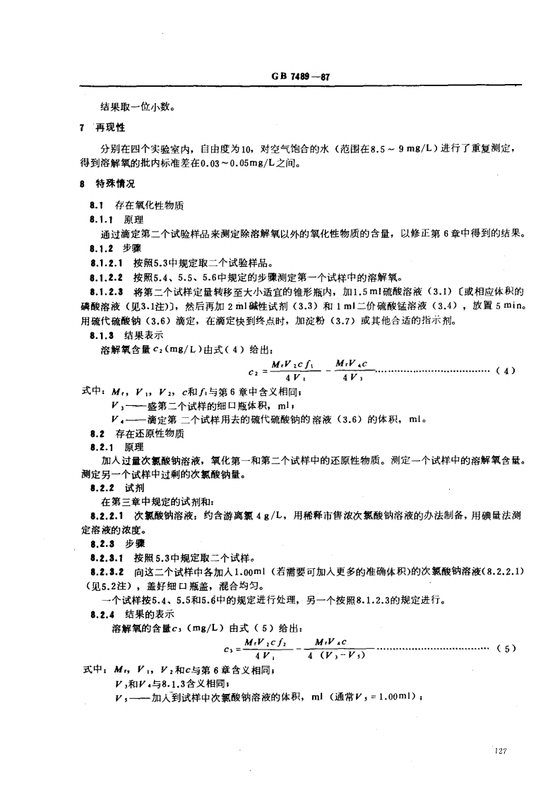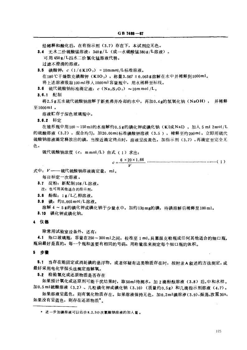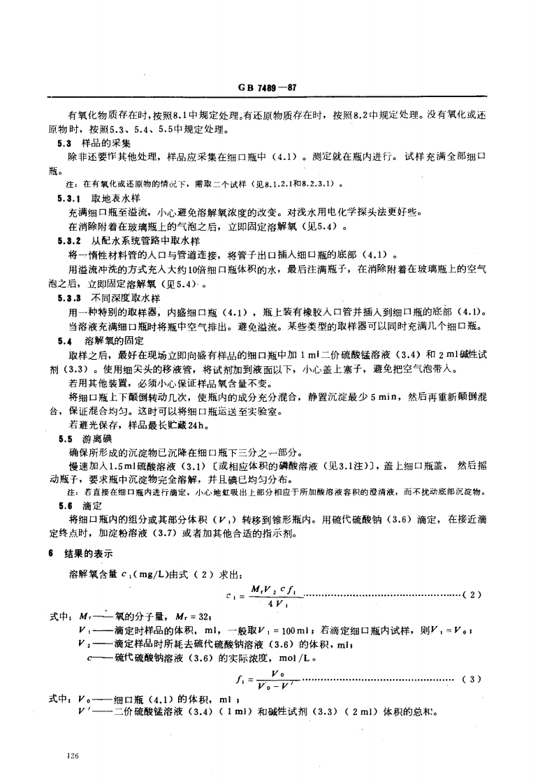 中华人民共和国国家标准UDC614.777:543.242.3:546.21水质氵溶解氧的测定碘量法G87489-87Water quality-Determinat ion ofdissolved oxygen-Iodometric method本标准等效采用国际标准IS05813一1983。本标准规定采用碘量法测定水中溶解氧,由于考虑到某些千扰而采用改进的温克勒(Winkler)法。1适用范围典量法是测定水中溶解氧的基准方法。在没有干扰的情况下,此方法适用于各种溶解氧浓度大于0.2mg/L和小于氧的饱和浓度两倍(约20mg/儿)的水样。易氧化的有机物,如丹宁酸、腐植酸和木质素等会对测定产生干扰。可氧化的疏的化合物,如疏化物疏脉,也如同易于消耗氧的呼吸系统那样产生干扰。当含有这类物质时,宜采用电化学探头法。亚硝酸盐浓度不高于15mg/L时就不会产生千扰,因为它们会被加人的叠氮化钠破坏掉。如存在氧化物质或还原物质,需改进测定方法,见第8章。如存在能固定或消耗碘的悬浮物,本方法需按附录A中叙述的方法改进后方可使用。2原理在样品中溶解氧与刚刚沉淀的二价氢氧化锰(将氢氧化钠或氢氧化钾加人到二价疏酸锰中制得)反应。酸化后,生成的高价锰化合物将碘化物氧化游离出等当量的碘,用疏代硫酸钠滴定法,测定游离碘量。8试剂分析中仅使用分析纯试剂和蒸馏水或纯度与之相当的水。&.1疏酸溶液·小心地把500ml浓疏酸(p=1.84g/m1)在不停搅动下加入到500ml水中。3.2疏酸溶液:c(1/2H,S0)=2mol/L。8.3碱性碘化物-叠氮化物试剂。注:当试样中亚硝酸氨含量大于0.5m8/L而亚铁含量不超过1mg/儿时为防止亚硝酸氮对测定结果的干涉,需在试样中加叠氨化物叠氨化钠是剧率试剂。若已知试样中的亚硝酸盐低于0.05m8/L:则可省去此试剂。.操作过程中严防中毒:b.不要使碱性磷化物一叠氨化物试剂(3.3)酸化,因为可能产生有毒的叠酸雾。将35B的氢氧化钠(NaOH)〔或50g的氢氧化钾(K0H))和30g碘化钾(KI)〔或27g碘化钠(NaI))溶解在大约50ml水中。单独地将1g的叠氮化钠(NaN,)溶于几毫升水中。将上述二种溶液混合并稀释至100m1。溶液贮存在塞紧的细口棕色瓶子里。·若怀疑有三价铁的存在,则采用磷酸(H,PO,P=1.70g/m1)。国家环境保护局1987-03-14批准1987-08-01实施121