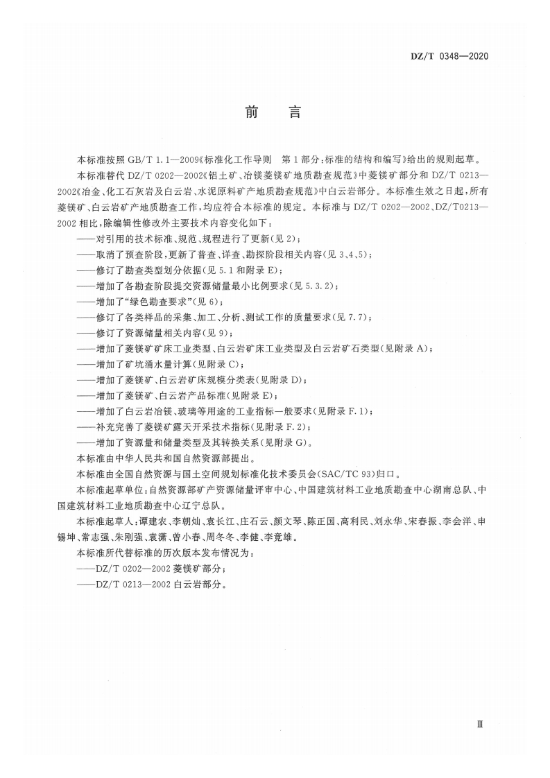 ICS73.020;73.080D13;D41:D52;Q430z中华人民共和国地质矿产行业标准DZ/T0348一2020代替DZ/T0202一2002菱镁矿部分代替DZ/T0213一2002白云岩部分矿产地质勘查规范菱镁矿、白云岩Specifications for magnesite and dolomite mineral exploration2020-04-30发布2020-04-30实施中华人民共和国自然资源部发布