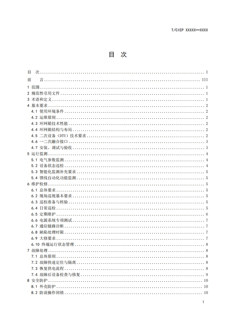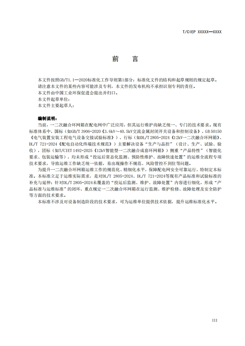 1CS29.130.10CCS K43TCIEP中国工业环保促进会团体标准T/CIEP XXXXX-XXXX一二次融合环网箱运行维护技术要求Technical requirements for operation and maintenance of integratedprimary-secondary ring main unit(征求意见稿)XXXX-XX-XX发布XXXX-Xx-XX实施中国工业环保促进会发布