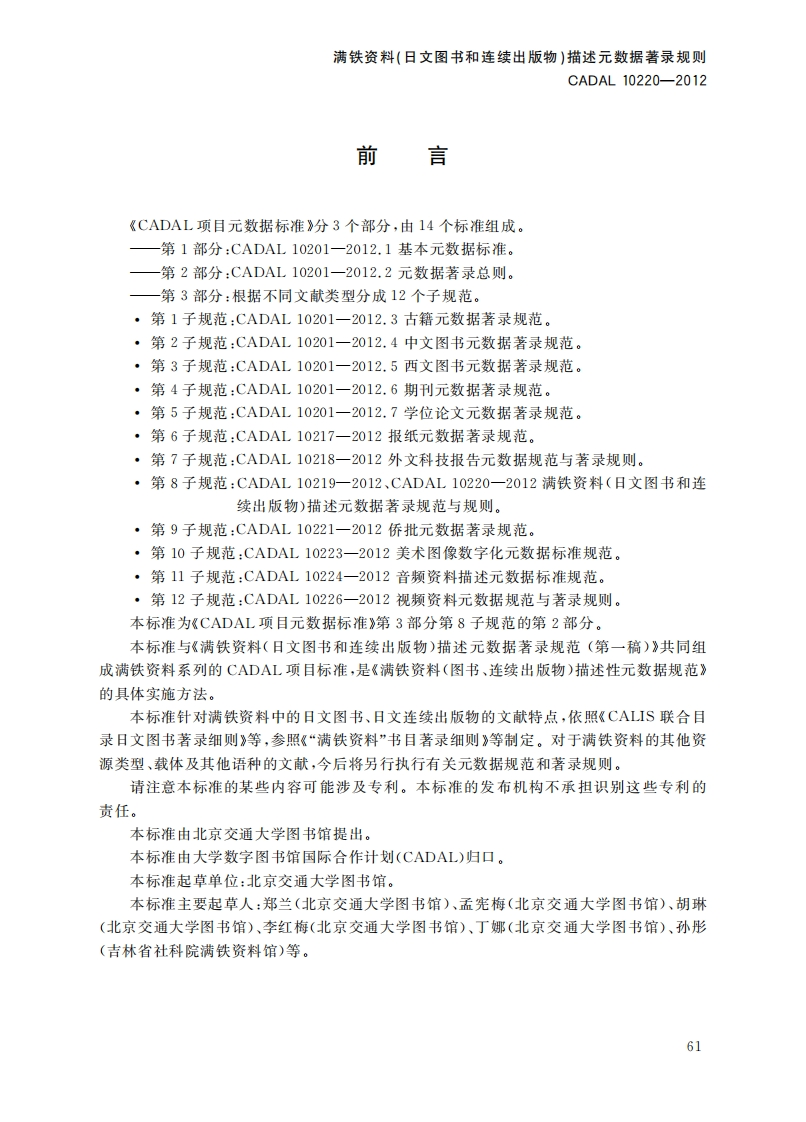 书和连续出版物)满铁资料(日文图描述元数据著录规则SouthManchuriaRailwayDataJapaneseBooksandSerialsGatalogingRulesforDescriptionMetadata348072@abc前天发布关注私信1.32MB21页037书和连续出版物)满铁资料(日文图描述元数据著录规则SouthManchuriaRailwayDataJapaneseBooksandSerialsGatalogingRulesforDescriptionMetadata此内容为付费资源,请付费后查看¥19¥23黄金会员免费钻石会员免费立即购买您当前未登录!建议登陆后购买,可保存购买订单付费资源 第1页 / 共21页 第2页 / 共21页 第3页 / 共21页 第4页 / 共21页 第5页 / 共21页 试读已结束,还剩16页,您可下载完整版后进行离线阅读 THE END标准规范 文本预览 10S01.140.20A14C A D A L项F目标准CADAL10220-2012满铁资料(日文图书和连续出版物)描述元数据著录规则South Manchuria Railway Data-Japanese Books and Serials-Gataloging Rules for Description Metadata第一稿2012-05-08发布20120509实施CADAL项目管理中心发布 查看更多 收起部分 喜欢就支持一下吧收藏