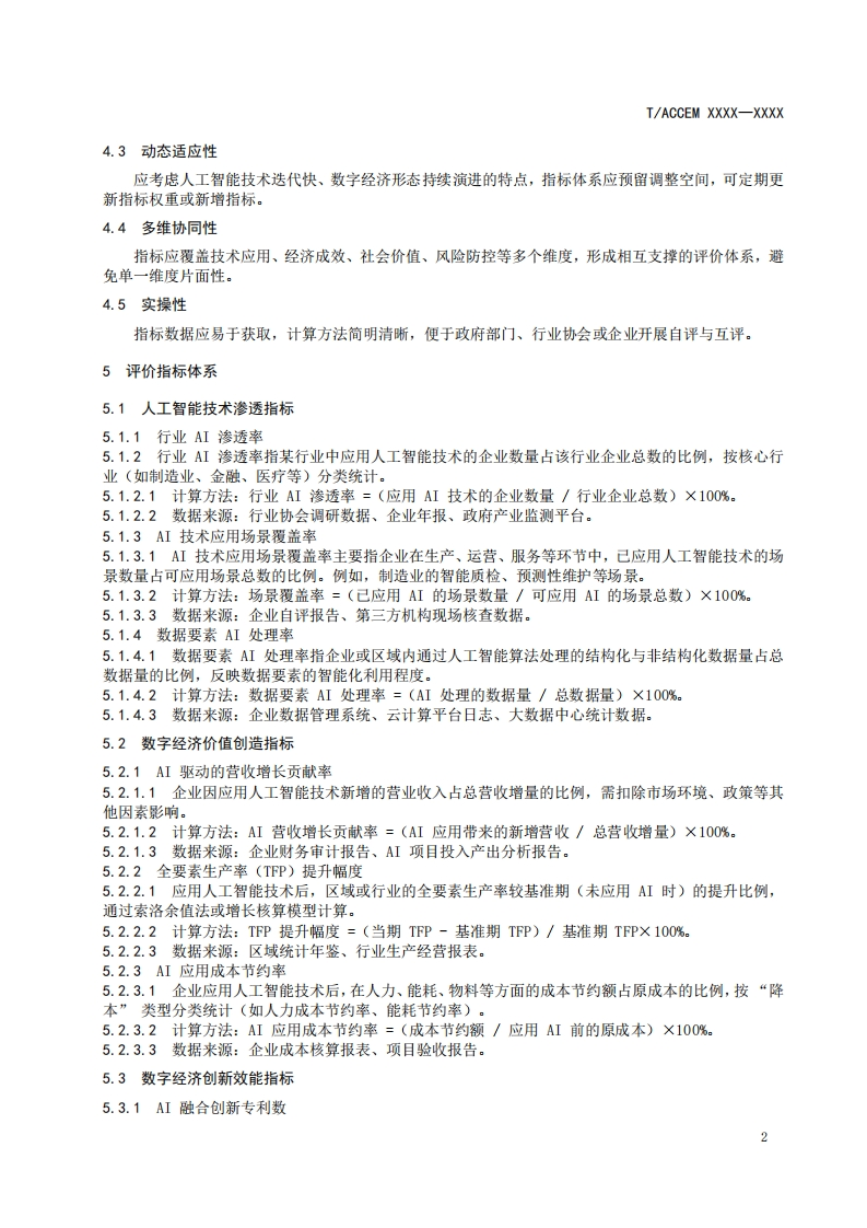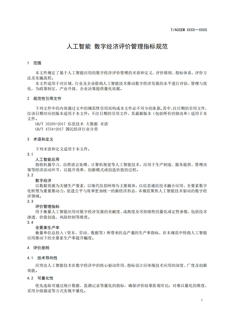 ICS03.120.01CCS A02T/ACCEM团体标准T/ACCEM XXXX-XXXX人工智能数字经济评价管理指标规范Artificial Intelligence and Digital Economy Evaluation Management IndicatorSpecification(征求意见稿)在提交反馈意见时,请将您知道的相关专利连同支持性文件一并附上。XXXX-Xx-XX发布XXXX-Xx-XX实施中国商业企业管理协会发布