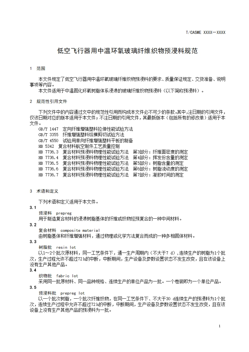 ICS点击此处添加1Cs号CCS点击此处添加cCS号T/CASME团体标准T/CASME XXXX-XXXX低空飞行器用中温环氧玻璃纤维织物预浸料规范Specification for Medium Temperature Curing Epoxy Resin Glass Fiber FabricPrepreg for Low Altitude Aerial Vehicle(征求意见稿)在提交反馈意见时,请将您知道的相联专利连同支持性文件一并附上。XXXX-XX-XX发布XXXX-XX-XX实施中国中小商业企业协会发布