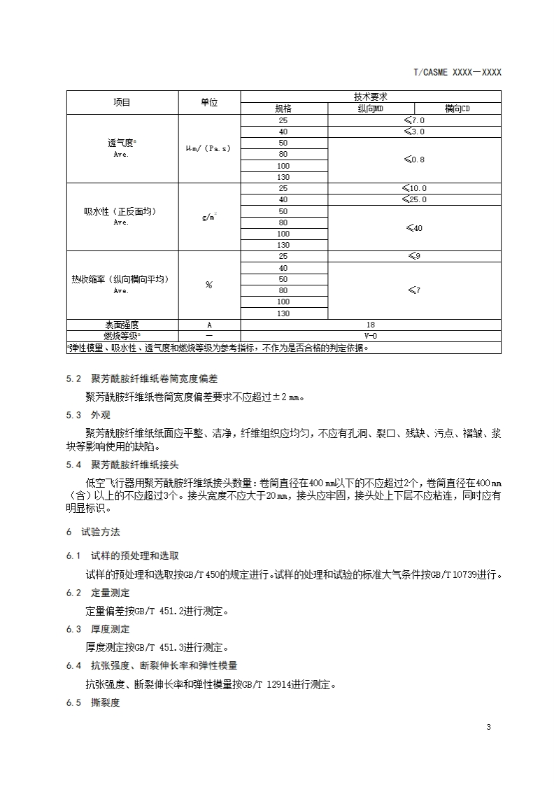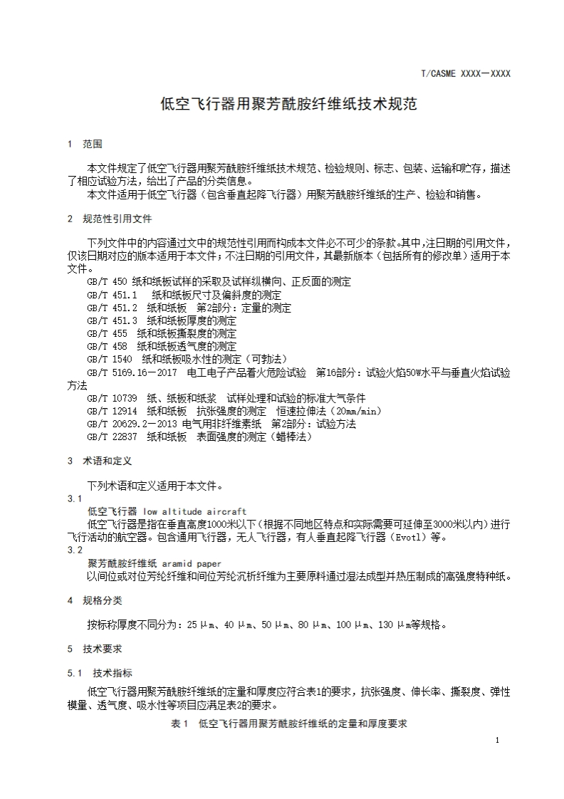 ICS29.035.99CCS V 10T/CASME团体标准T/CASME XXXX-XXXX低空飞行器用聚芳酰胺纤维纸技术规范Aramid paper used as honeycomb core material for electric vertical takeoff andlanding vehicles (eVTOL)(征求意见稿)在提交反馈意见时,请将您知道的相联专连同肢持性文件一并附上。XXXX-XX-XX发布XXXX-XX-XX实施中国中小商业企业协会发布