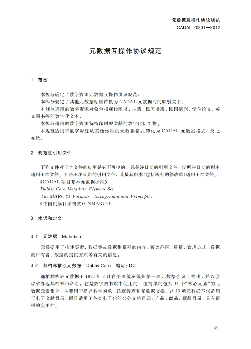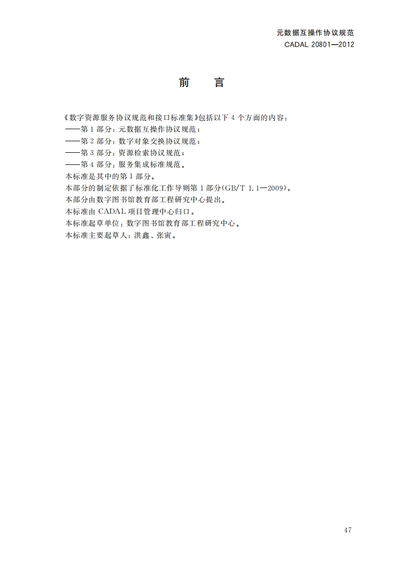 元数据互操乍协议规范MetadataInteroperabilityProtocolSpecification第一稿348072@abc4小时前发布关注私信0.36MB8页046元数据互操乍协议规范MetadataInteroperabilityProtocolSpecification第一稿此内容为付费资源,请付费后查看¥19¥23黄金会员免费钻石会员免费立即购买您当前未登录!建议登陆后购买,可保存购买订单付费资源 第1页 / 共8页 第2页 / 共8页 第3页 / 共8页 第4页 / 共8页 第5页 / 共8页 试读已结束,还剩3页,您可下载完整版后进行离线阅读 THE END标准规范 文本预览 1CS01.140.20A14C A D A L项目标准CADAL20801-2012元数据互操作协议规范Metadata Interoperability Protocol Specification第一稿2012-05-08发布201205-09实施CADAL项目管理中心发布 查看更多 收起部分 喜欢就支持一下吧收藏
