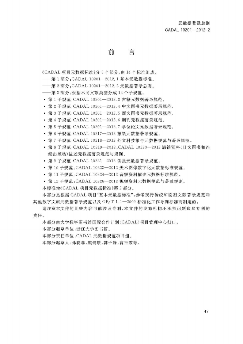 元数据录总则MetadataGeneralRules第-稿348072@abc2小时前发布关注私信2.92MB13页049元数据录总则MetadataGeneralRules第-稿此内容为付费资源,请付费后查看¥19¥23黄金会员免费钻石会员免费立即购买您当前未登录!建议登陆后购买,可保存购买订单付费资源 第1页 / 共13页 第2页 / 共13页 第3页 / 共13页 第4页 / 共13页 第5页 / 共13页 试读已结束,还剩8页,您可下载完整版后进行离线阅读 THE END标准规范 文本预览 1CS01.140.20A14CA、DAL项目标准CADAL10201-2012.2元数据著录总则Metadata General Rules第一稿2012-05-08发布2012-05-09实施CADAL项目管理中心发布 查看更多 收起部分 喜欢就支持一下吧收藏