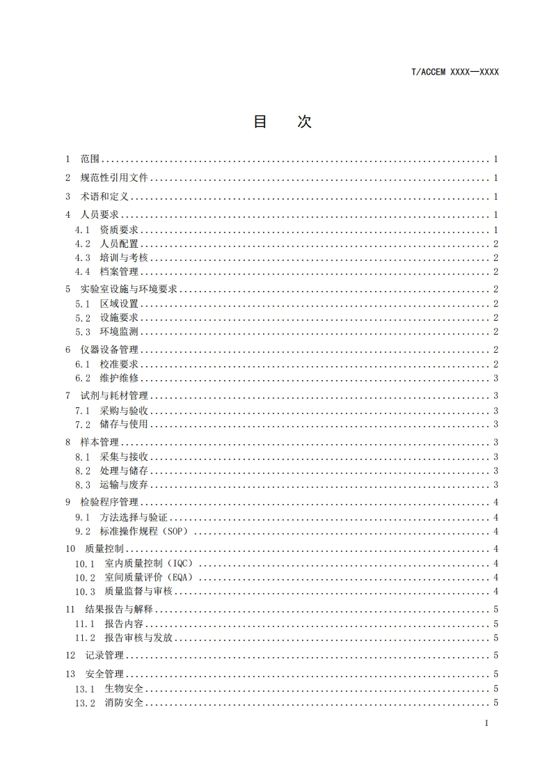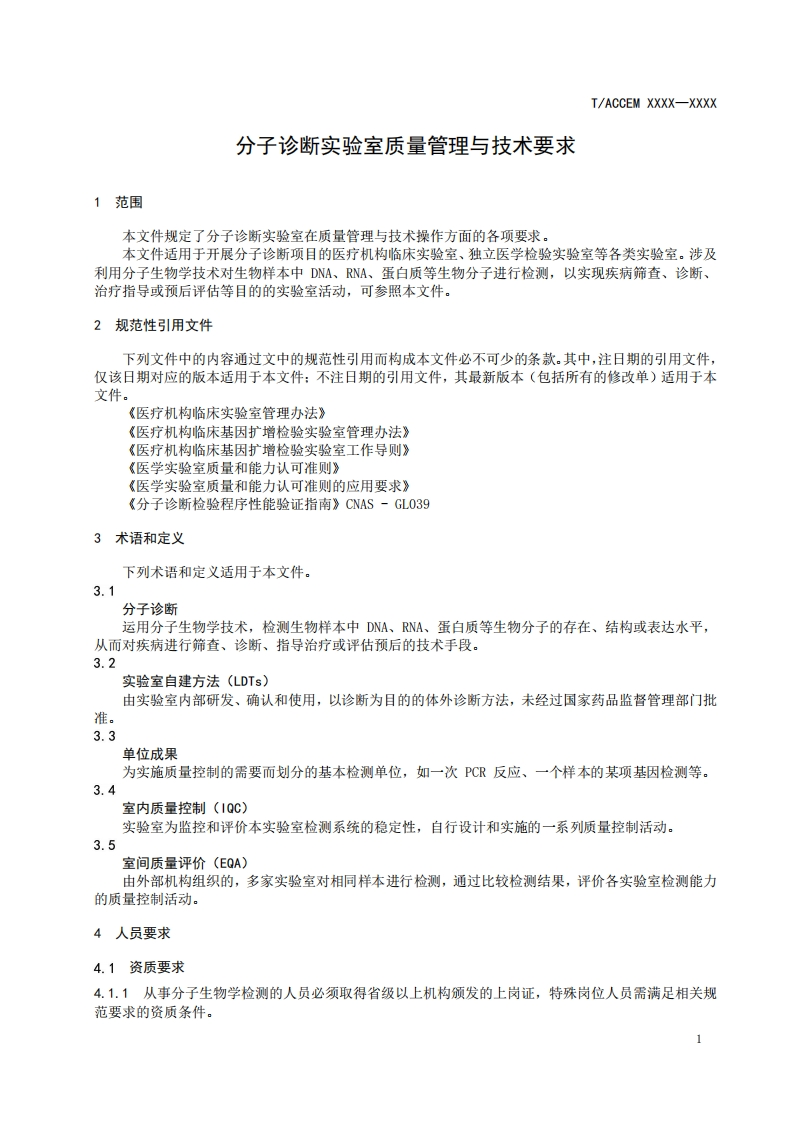 ICS11.100CCS NO1T/ACCEM团体标准T/ACCEM XXXX-XXXX分子诊断实验室质量管理与技术要求Quality management and technical requirements for molecular diagnostic laboratories(征求意见稿)在提交反债意见时,请将您知道的相关专利连同支持性文件一并附上。XXXX-Xx-XX发布XXXX-Xx-XX实施中国商业企业管理协会发布