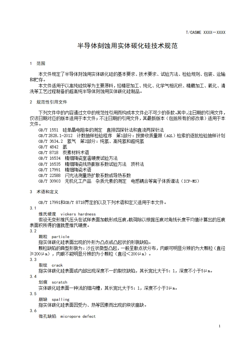 半导体刻蚀用实体碳化硅技术规范TechnicalSpecificationforSolidSiliconforSemiconductorEtching348072@abc11小时前发布关注私信0.22MB10页029半导体刻蚀用实体碳化硅技术规范TechnicalSpecificationforSolidSiliconforSemiconductorEtching此内容为付费资源,请付费后查看¥19¥23黄金会员免费钻石会员免费立即购买您当前未登录!建议登陆后购买,可保存购买订单付费资源 第1页 / 共10页 第2页 / 共10页 第3页 / 共10页 第4页 / 共10页 第5页 / 共10页 试读已结束,还剩5页,您可下载完整版后进行离线阅读 THE END标准规范 文本预览 ICSCCS点击此处添加CCS号T/CASME团体标准T/CASME XXXX-XXXX半导体刻蚀用实体碳化硅技术规范Technical Specification for Solid Silicon for Semiconductor Etching(征求意见稿)在提交反馈意见时,请将您知道的相联专连同肢持性文件一并附上。XXXX-XX-XX发布XXXX-XX-XX实施中国中小商业企业协会发布 查看更多 收起部分 喜欢就支持一下吧收藏